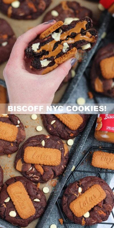 Gooey and giant Biscoff stuffed NYC Cookies with the most delicious chocolate chip cookie mix!!