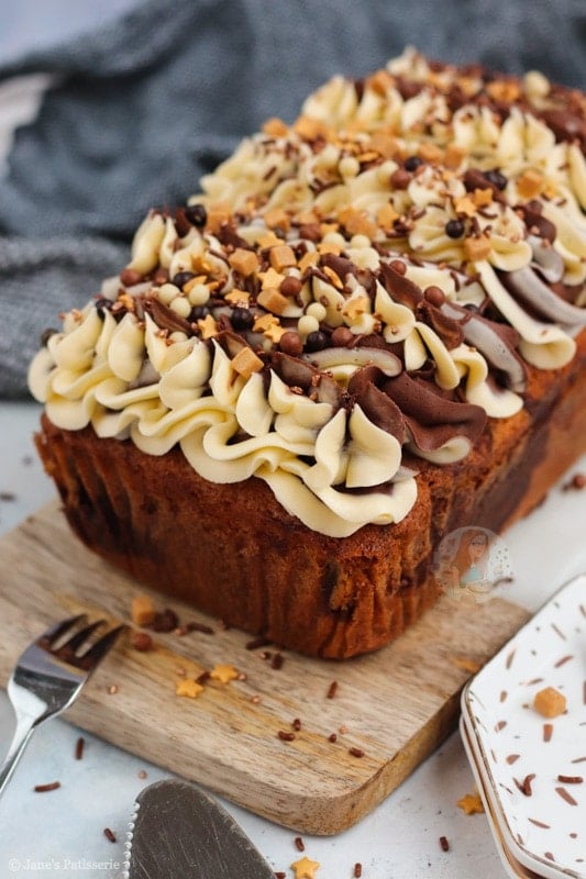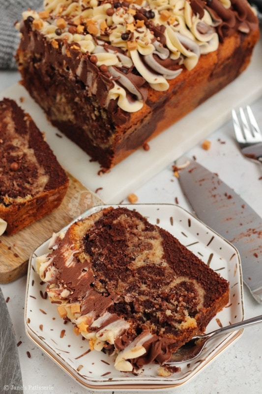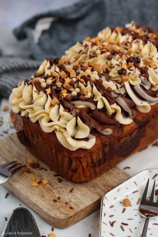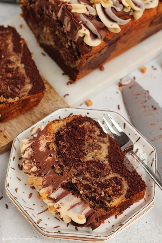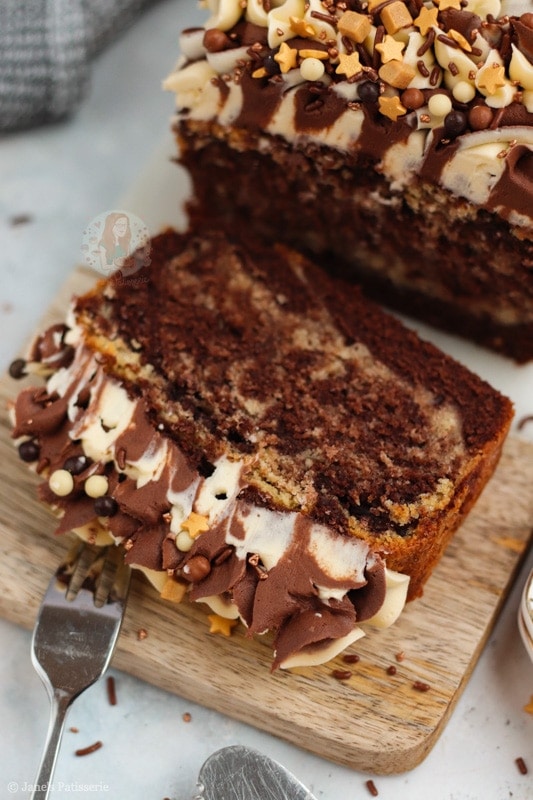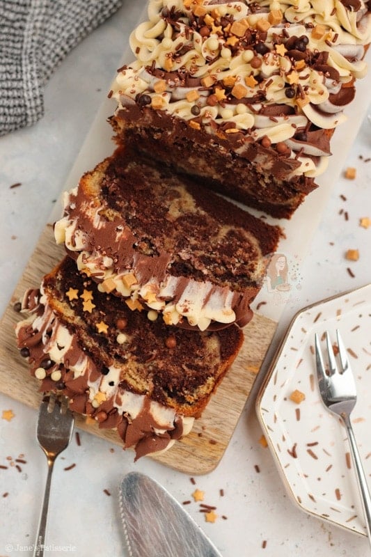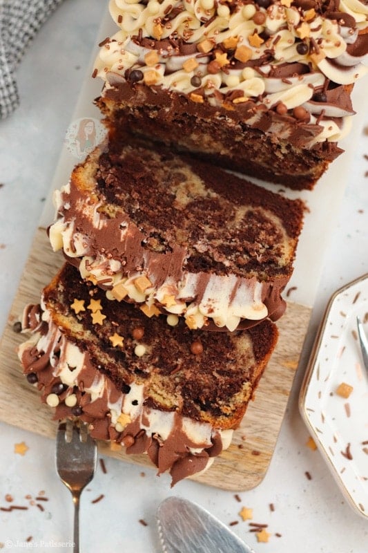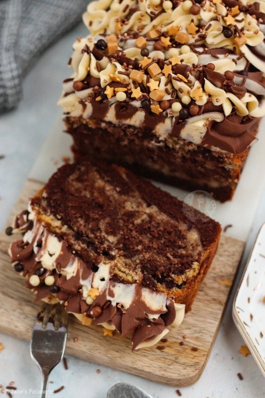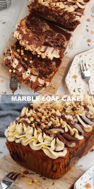 A yummy chocolate and vanilla loaf cake, topped with chocolate and vanilla buttercream frosting – the best marble loaf cake!