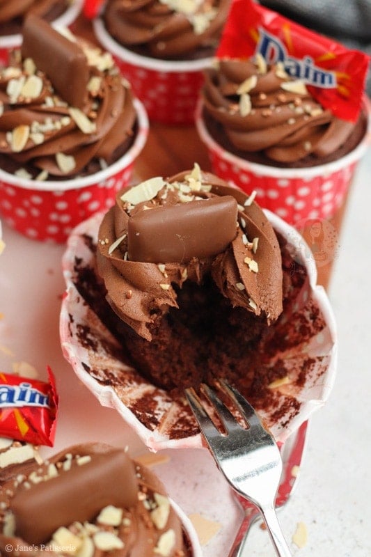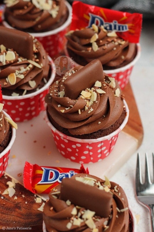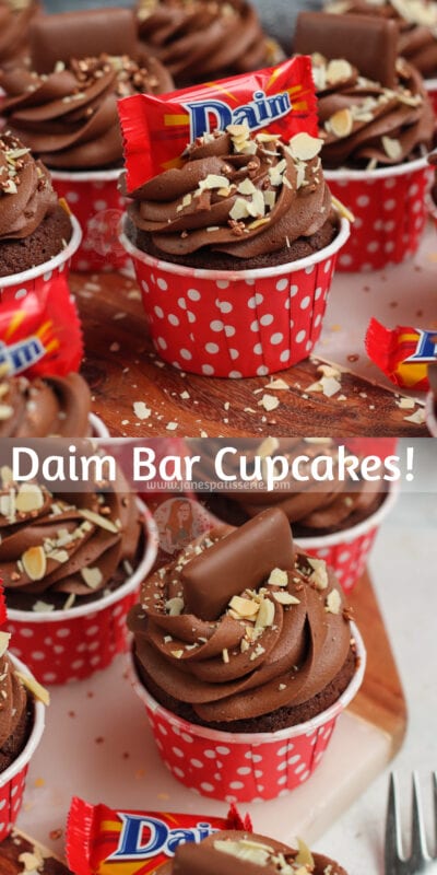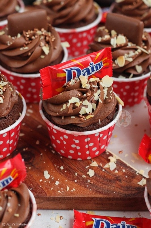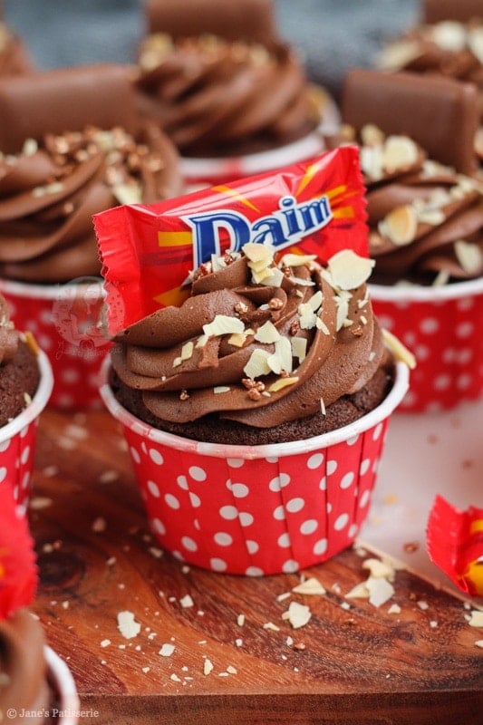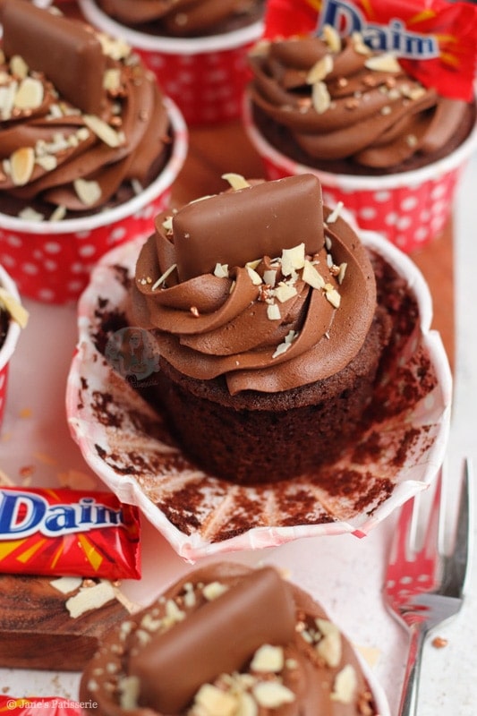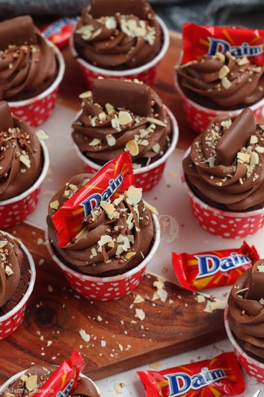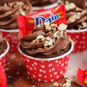 Delicious Daim Bar cupcakes stuffed with Daim Bar pieces, topped with a luscious chocolate buttercream frosting and more Daim Bar!