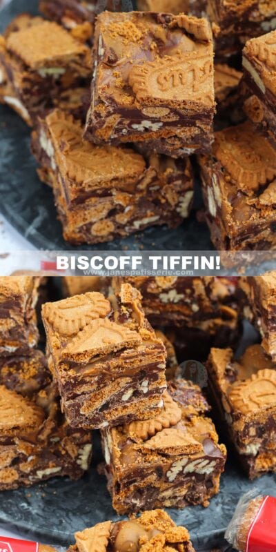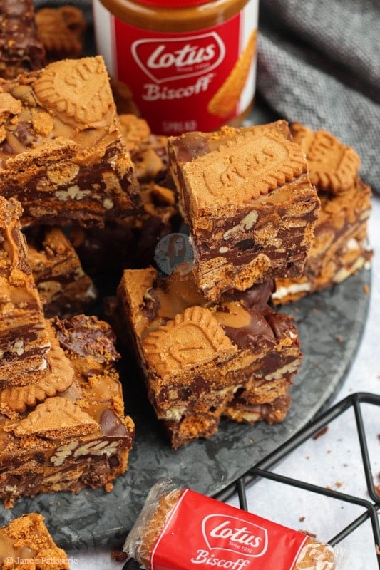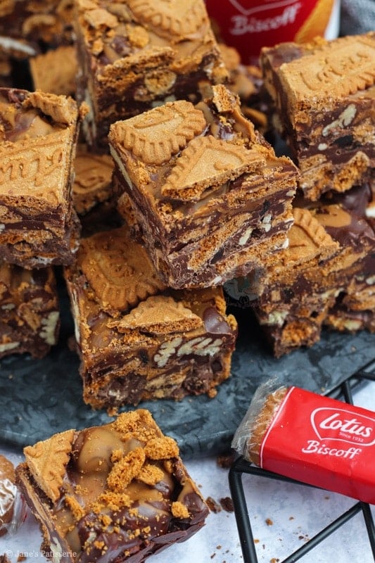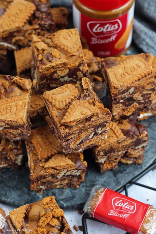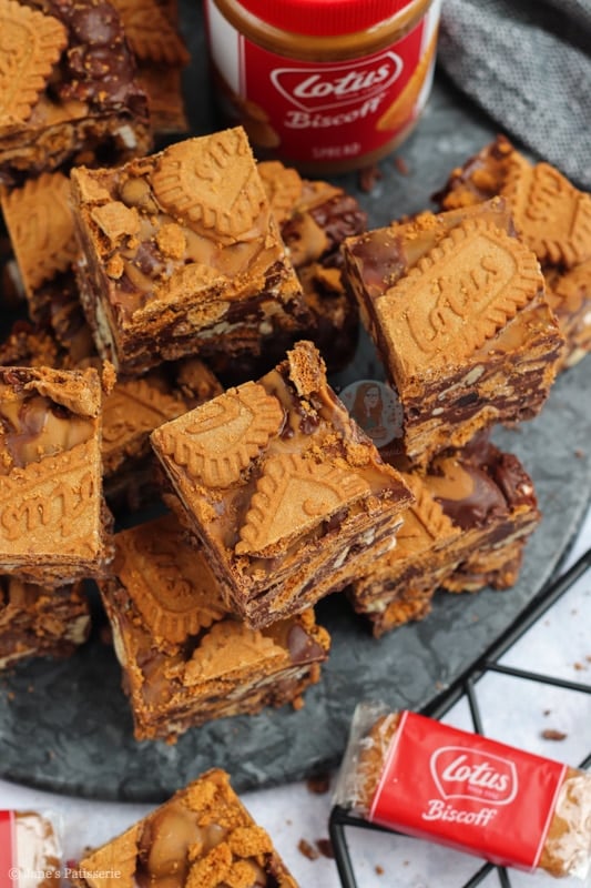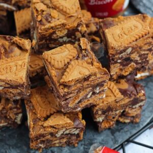 A delicious no-bake Biscoff tiffin with Biscoff biscuits, Biscoff spread, and even more delicious goodies!
