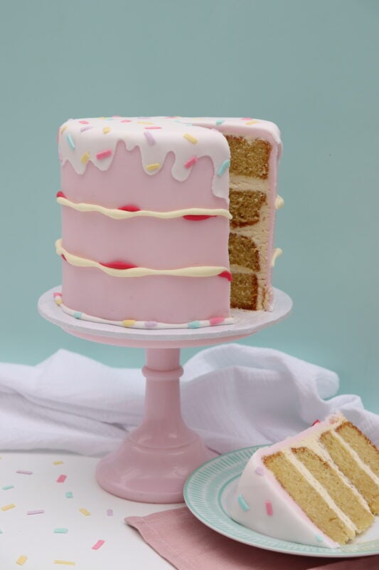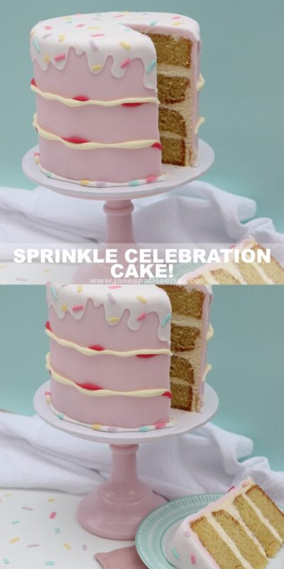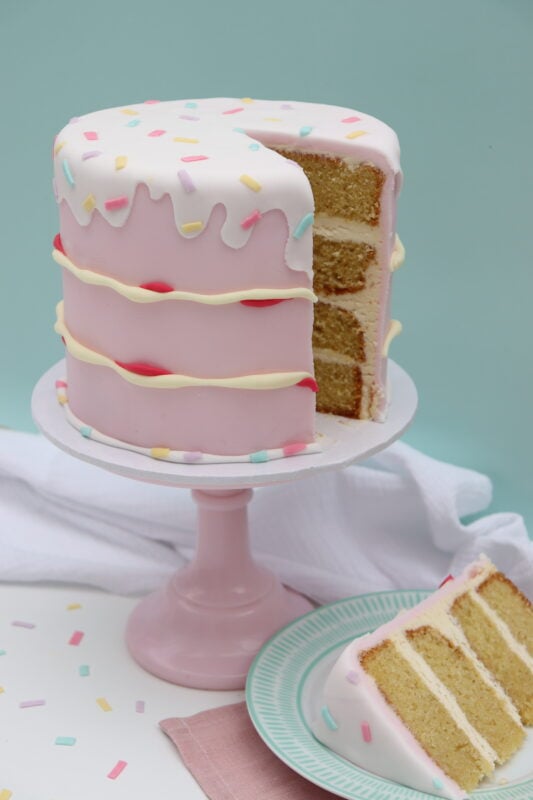 A blog post dedicated to how to make a sprinkle celebration cake with a vanilla sponge, vanilla buttercream, and fondant decoration from Dani at Blue Door Bakery!