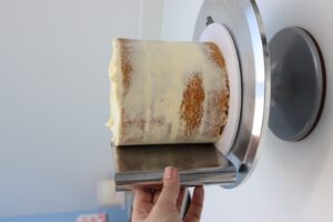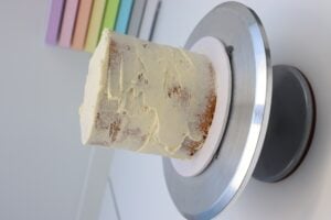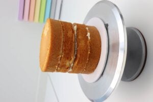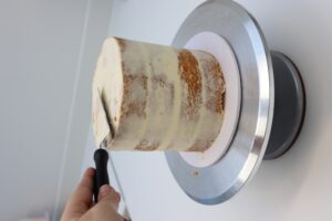 - Take a side scraper and start to gently scrape away some buttercream. The sides of the cake should be straight and all gaps filled.