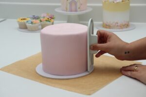 - Once the excess fondant has been trimmed neatly, take a cake smoother and smooth over the cake getting rid of any hand marks or imperfections.