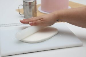 - Take 150g of white fondant and kneed until soft. Roll out until 2-3 mm thin. Use cornflour so it doesn’t stick to the surface.