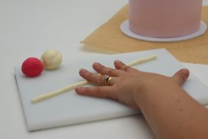 - Using your left over white paste, colour a small ball in pale yellow and a raspberry jam colour. Roll out a long sausage of pale yellow, purposely but gently pressing your fingers in as you roll to get an uneven shape.