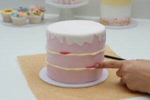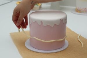 - Brush a strip of water around the cake and add this strip on. Don’t worry if it breaks or you have to join it up.