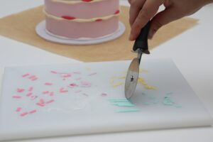 - Using a sharp knife, cut out a wiggly shape. You can use a ruler to make sure its big enough for top of the cake. Add some water to the top of the cake which will glue the top down.