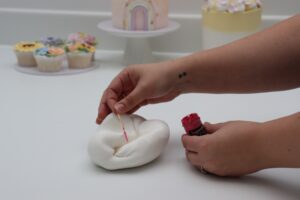 - Take approximately 800g of fondant and add some colour. I’ve used Sugarflair baby pink. Kneed well until the colour is even.