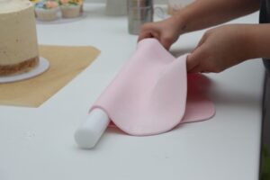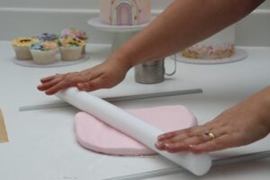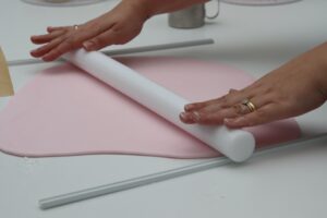 - Sprinkle some cornflour on the worktop. Put your spacers either side of your fondant and begin rolling out. Keep moving your fondant round after every couple of rolls so it doesn’t stick to the work surface.