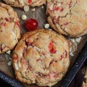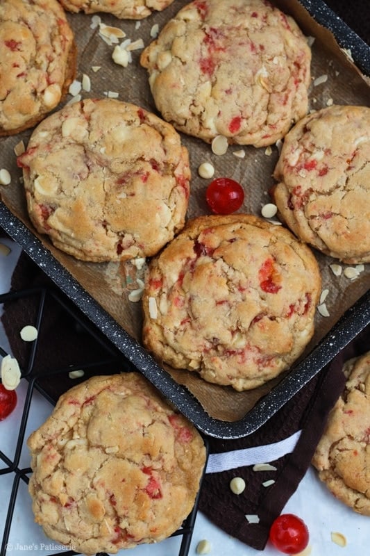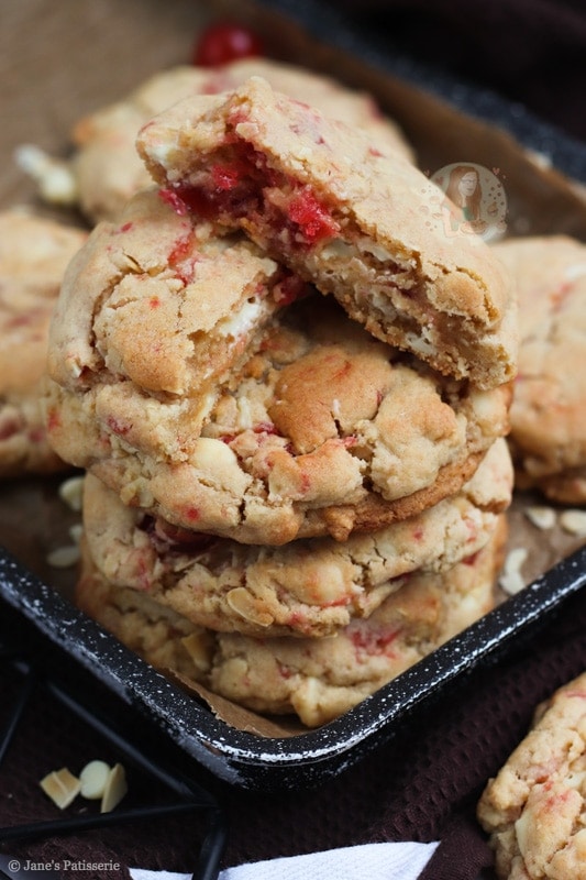 Giant chunky bakewell NYC cookies stuffed with almond flakes, white chocolate chips and glacé cherries!