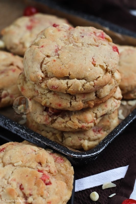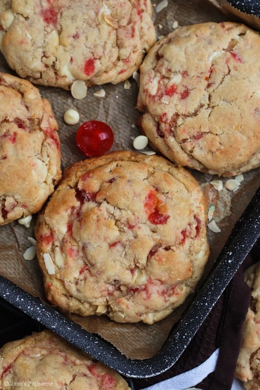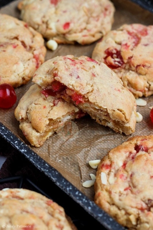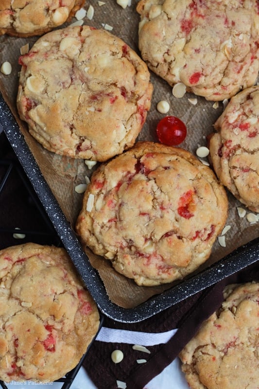 The marriage of a vanilla and almond cookie dough, stuffed with white chocolate chips, toasted flaked almonds, and chopped glacé cherries is just SO GOOD. It may sound odd, but if you like the Bakewell theme you will love these!