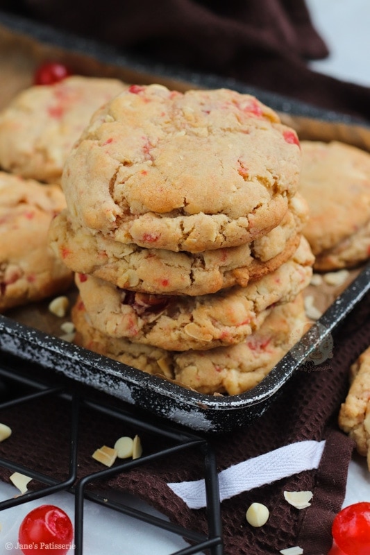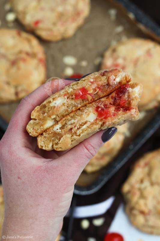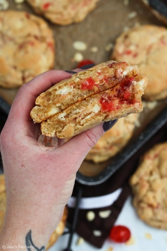 I used glacé cherries compared to real cherries as I didn’t want too much extra added moisture… but I wanted some thing cherry like. I did also use cherries over a different fruit as again I didn’t want added moisture! They also made the cookies look really pretty.
