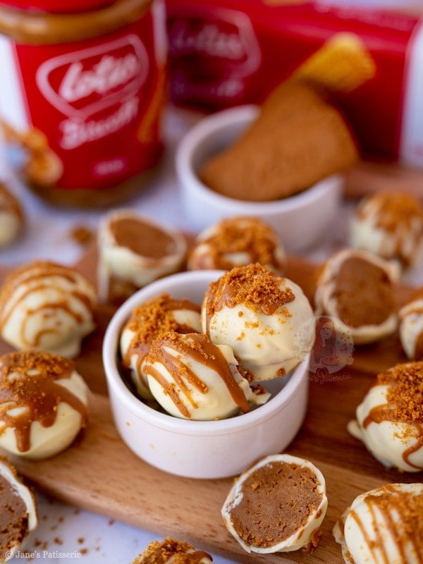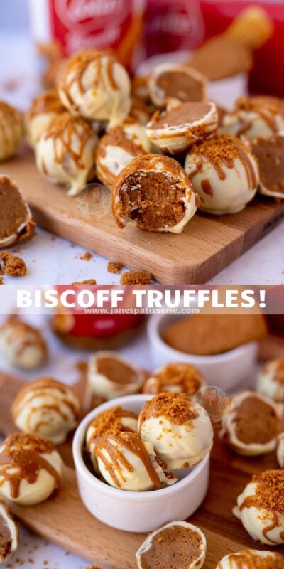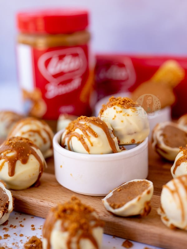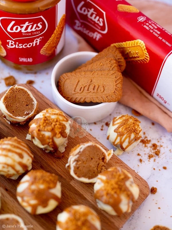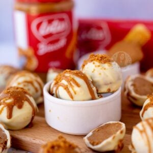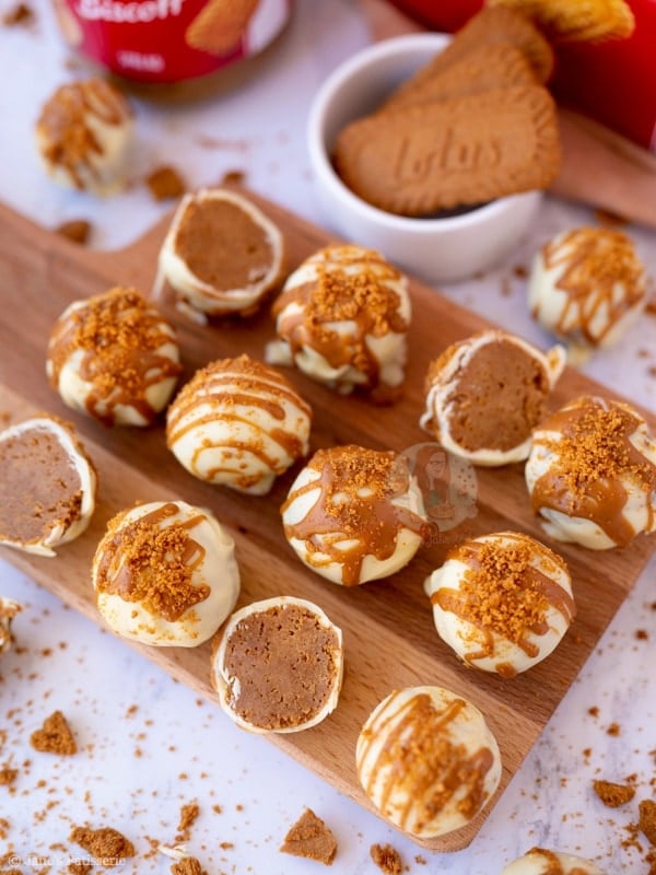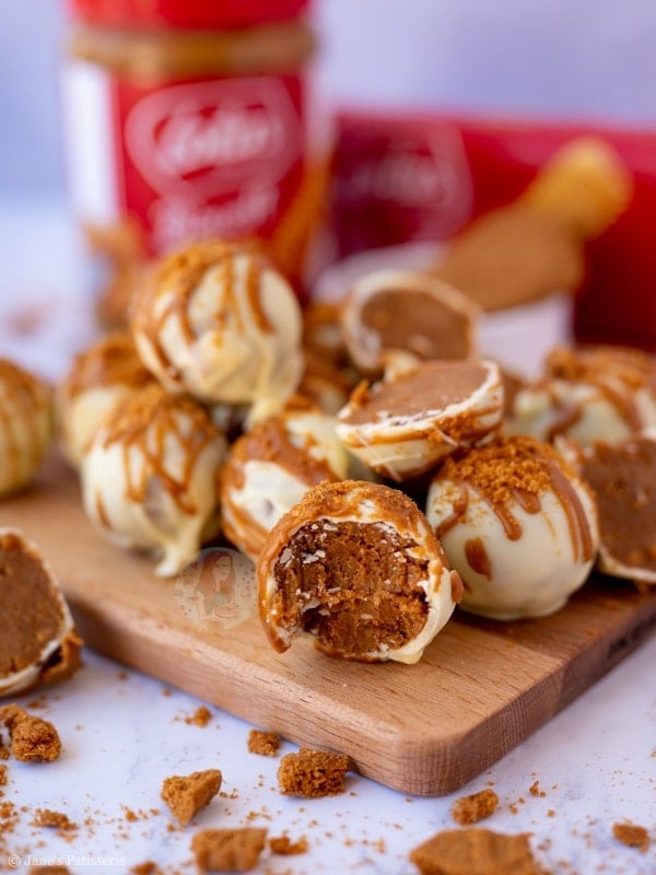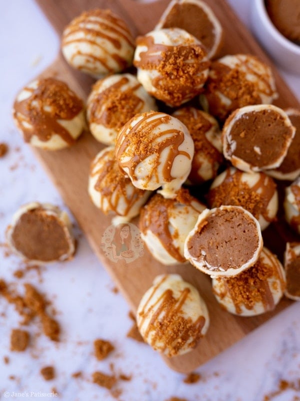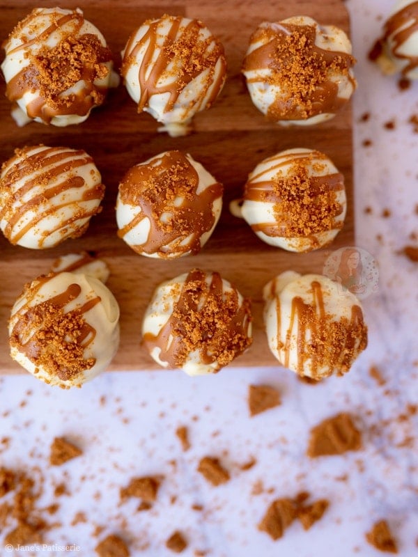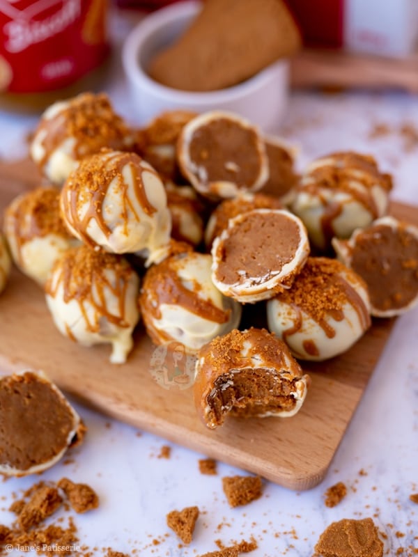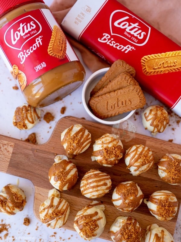 Easy cheesecake biscoff truffles with a white chocolate coating and even more biscoff!