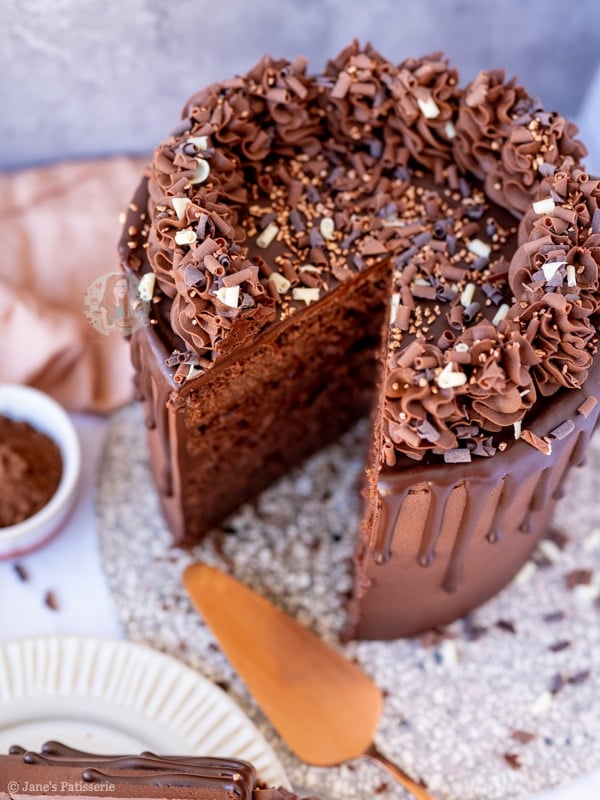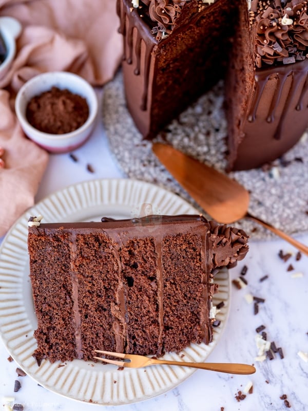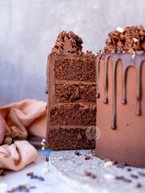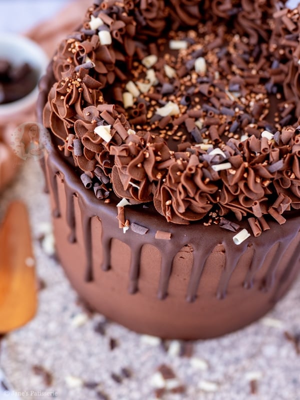 A four-layer chocolate drip cake with chocolate sponges, chocolate buttercream frosting and more – a part of my back to basics blog series!