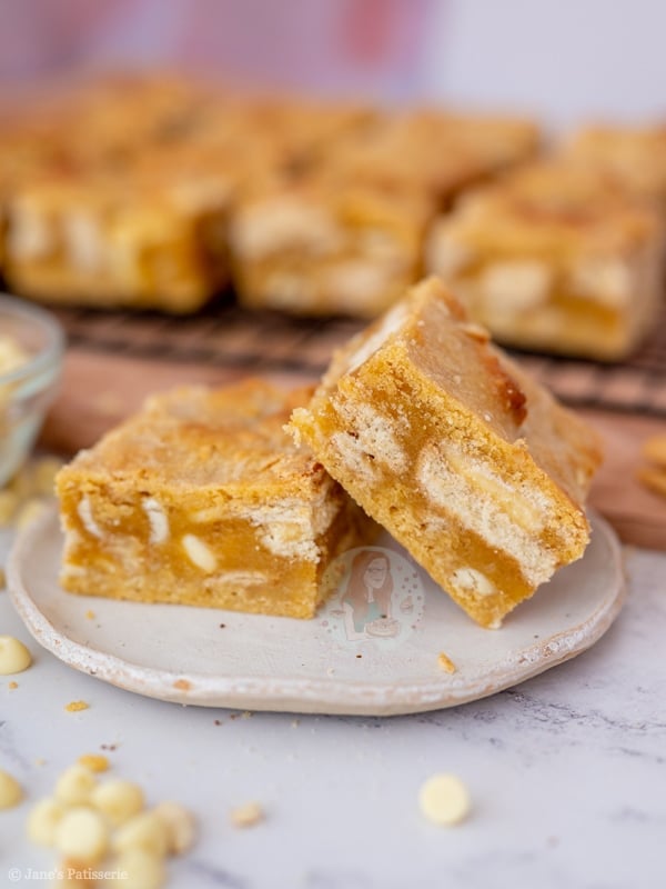 I will say now, as I do in all my blondies at the moment, I do not use a melted white chocolate base. Technically, a blondie is a non-chocolate brownie – so without the cocoa or dark chocolate. They are also known as white chocolate brownies, but I don’t actually like using white chocolate with this recipe!