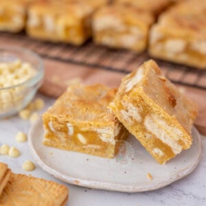 I find when adding the melted white chocolate to this recipe changes it and it just doesn’t taste as nice! I will produce a white chocolate one in the future, but for now… please just stick with this recipe as it is. It’s a blonde coloured traybake = blondie!
