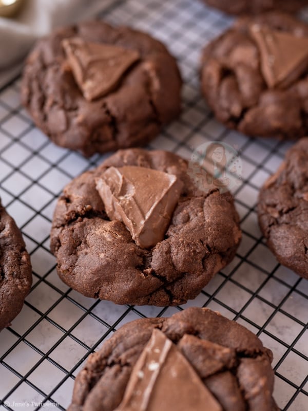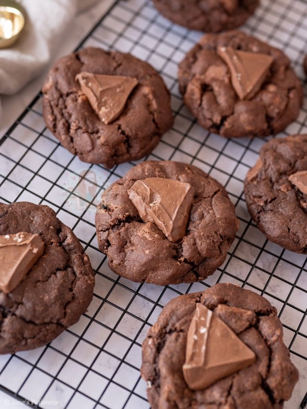 - Once baked, add on another piece of Toblerone and press down slightly to stick to the cookie. Leave the cookies to cool on the tray for at least 30 minutes, as they will continue to bake whilst cooling!
