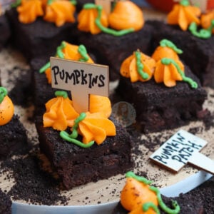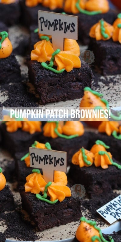 Rich gooey chocolate brownies, chocolate buttercream frosting, oreo dirt and buttercream pumpkins make the best pumpkin patch brownies ever!