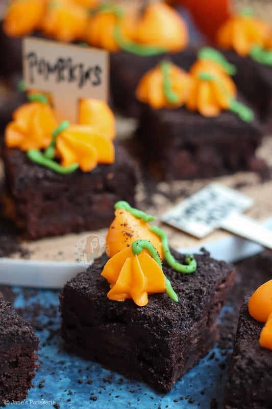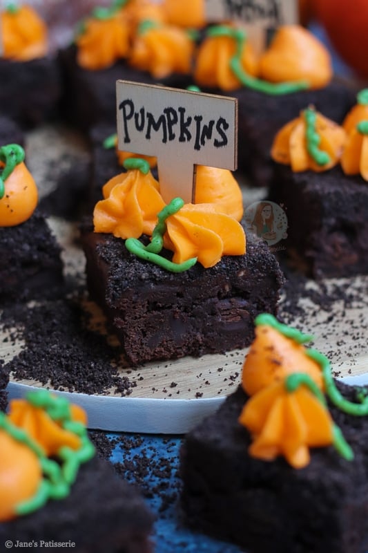 I wanted to do a halloween themed brownie because they are just fun to do – and couldn’t work out whether to do a graveyard brownie, or creepy sweets making something spooky, but a pumpkin patch brownie?! Even better!