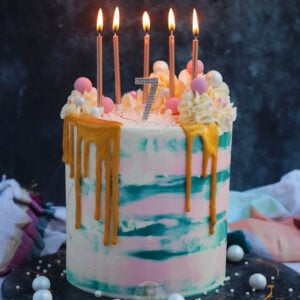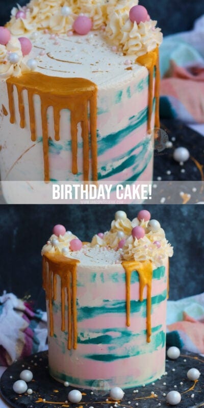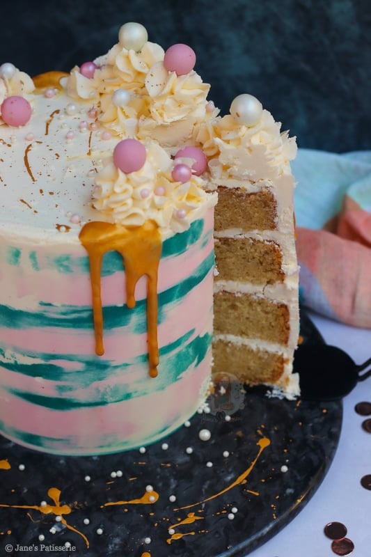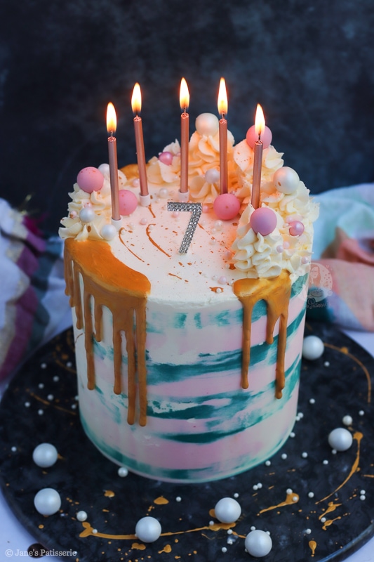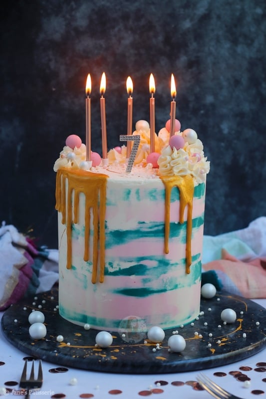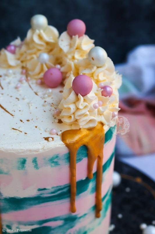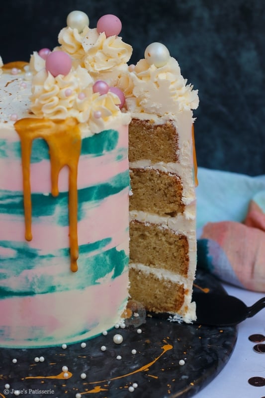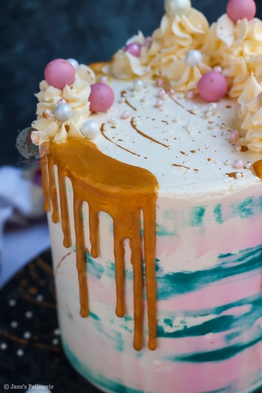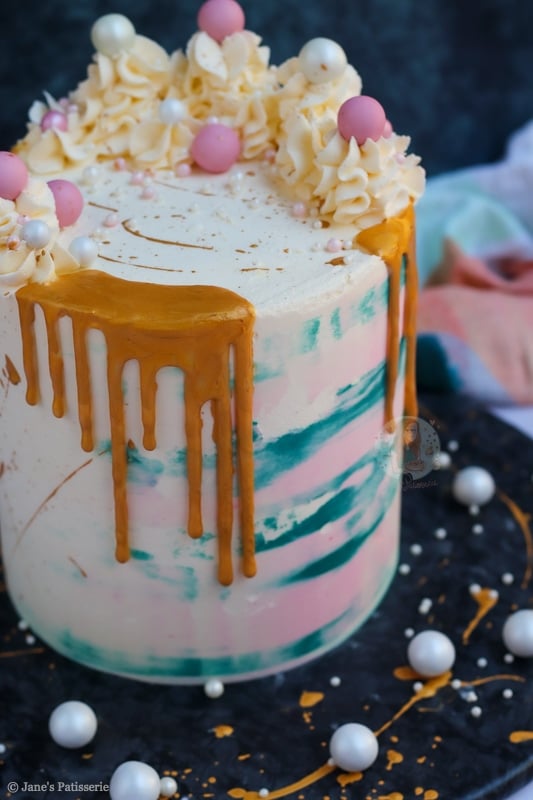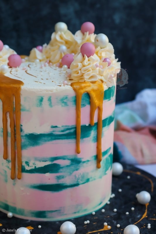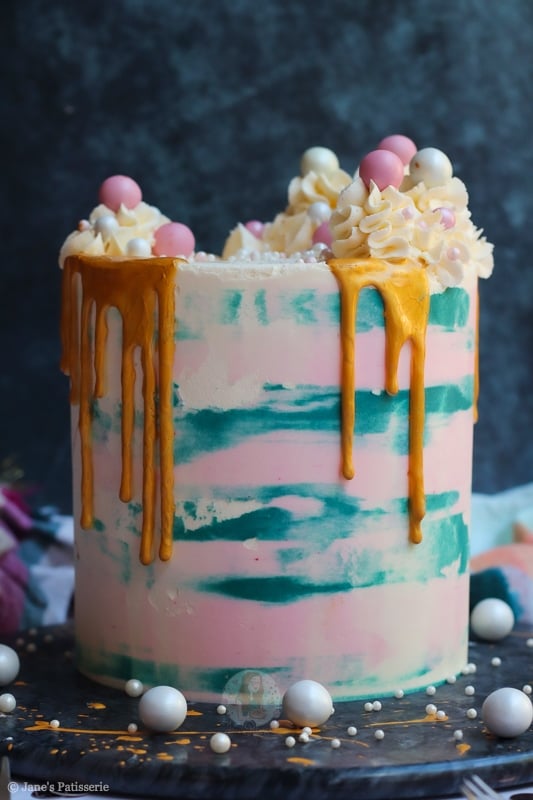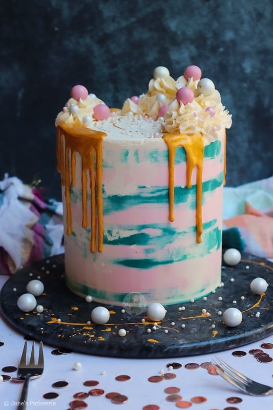 So this cake became a buttercream smudge effect for the decoration, with a gold drip, piped buttercream, splatters of paint, pearl sprinkles and more.. and is maybe a little OTT?! But honestly can it be OTT when it’s a celebration like today? Obsessed.