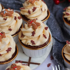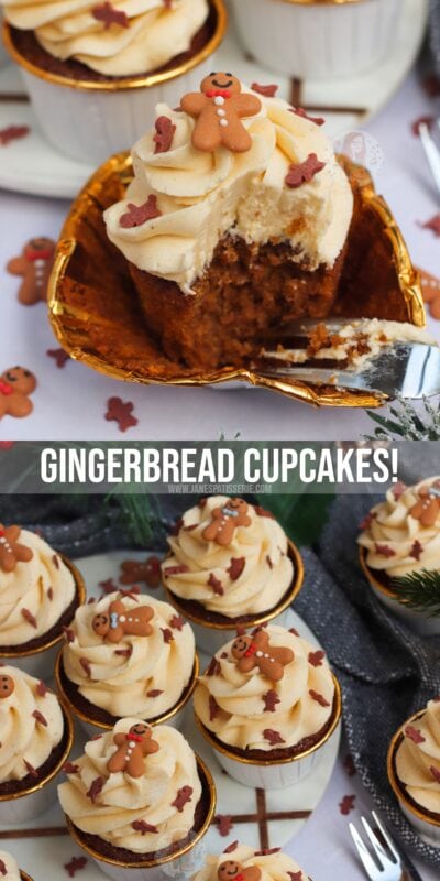 Easy and sweet gingerbread cupcakes with a gingerbread sponge, ginger buttercream frosting, and the cutest decoration! Perfect Christmas cupcakes.