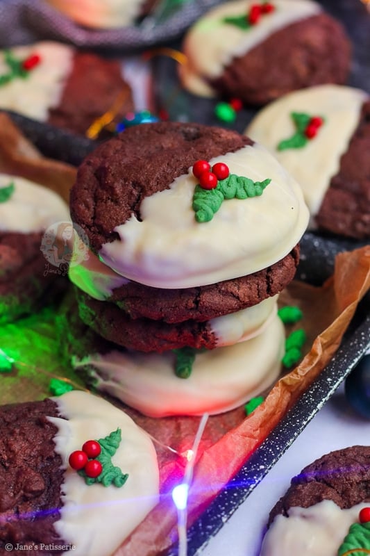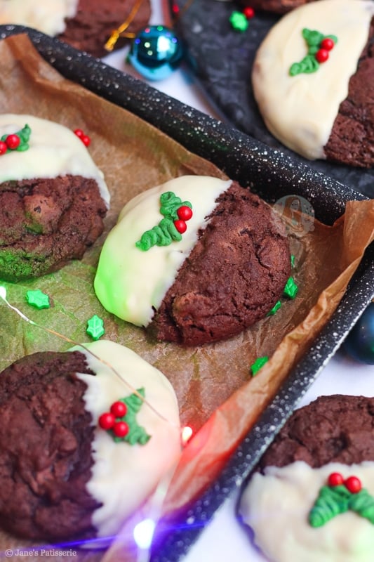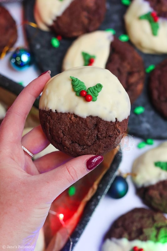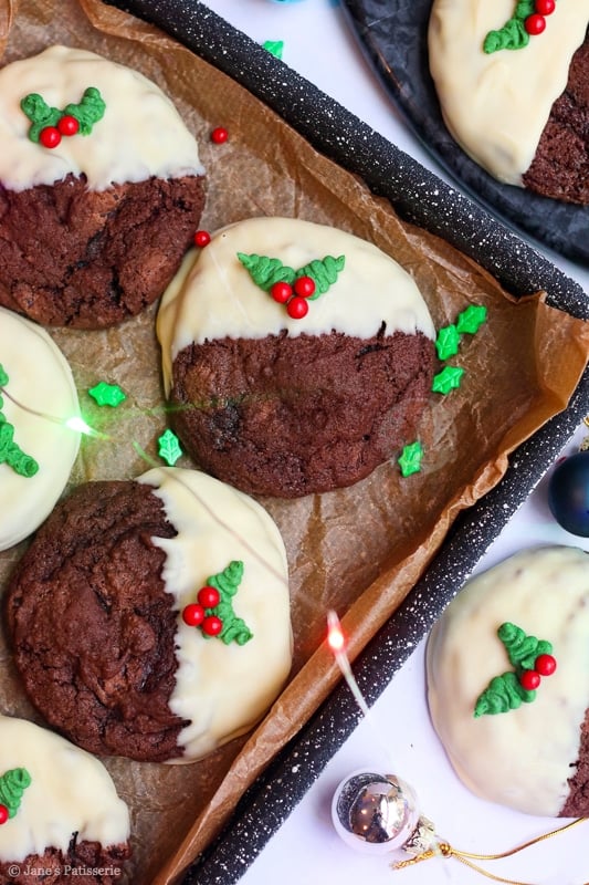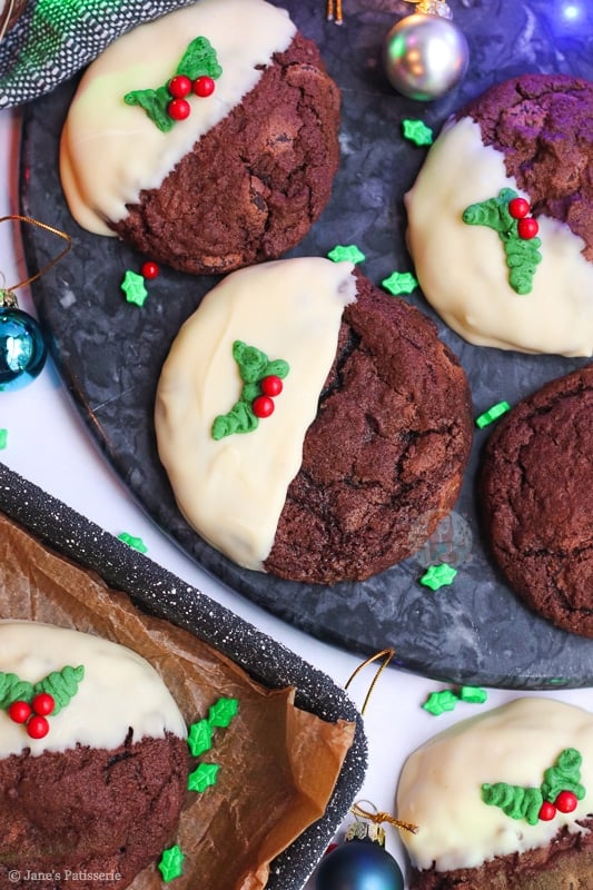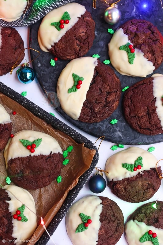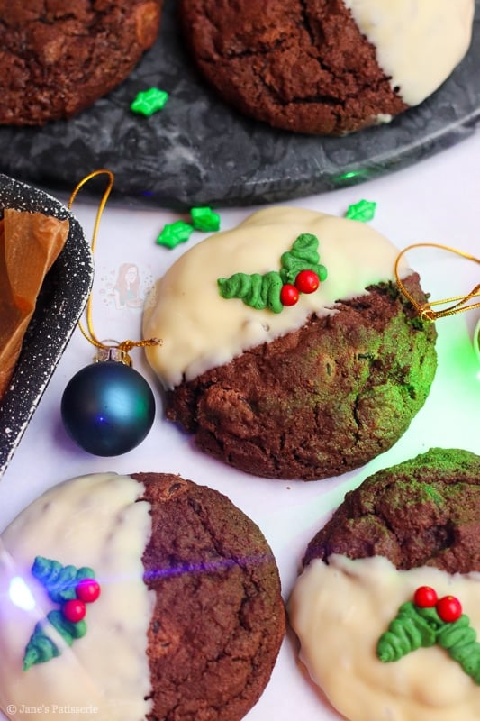 This year, the bake of the season is these beauties… Christmas pudding cookies!! I had so many requests for these in the past, and I just had so many ideas I could never fit them in – but this year I made sure I could. Just look at them! Chocolate cookie heaven.