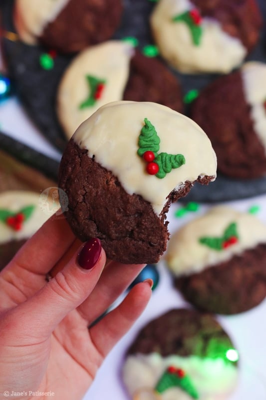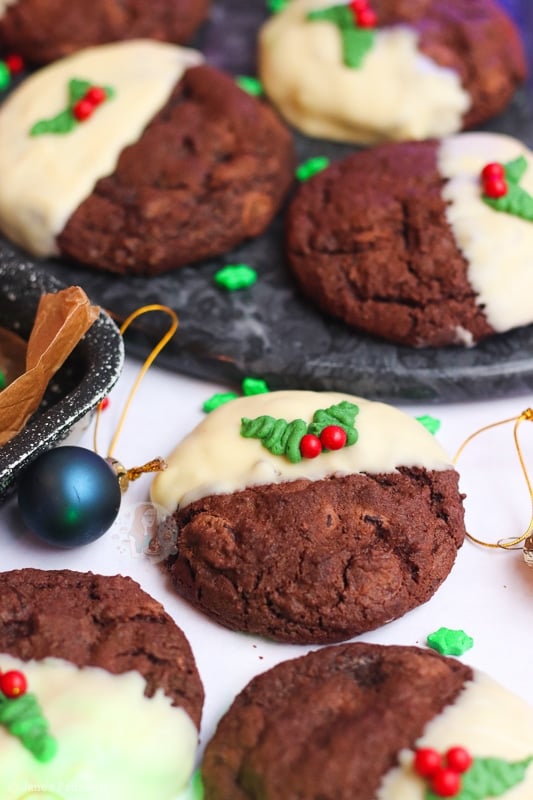 Delicious triple chocolate Christmas pudding cookies with milk and dark chocolate chunks, a white chocolate coating, and a holly buttercream decoration!