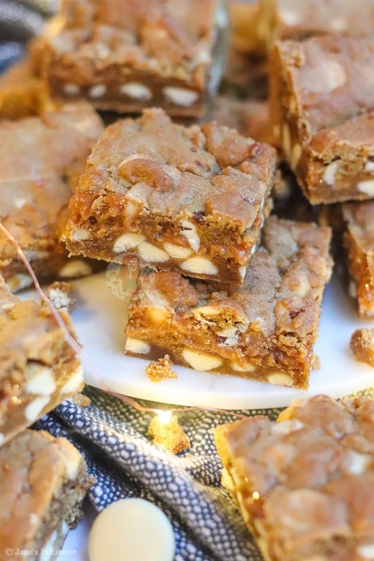 For this my caramel gingerbread cookie bars recipe, I thought white chocolate chips would go the best as they always do – but you can use milk chocolate, or dark chocolate if you prefer… or even a mix!