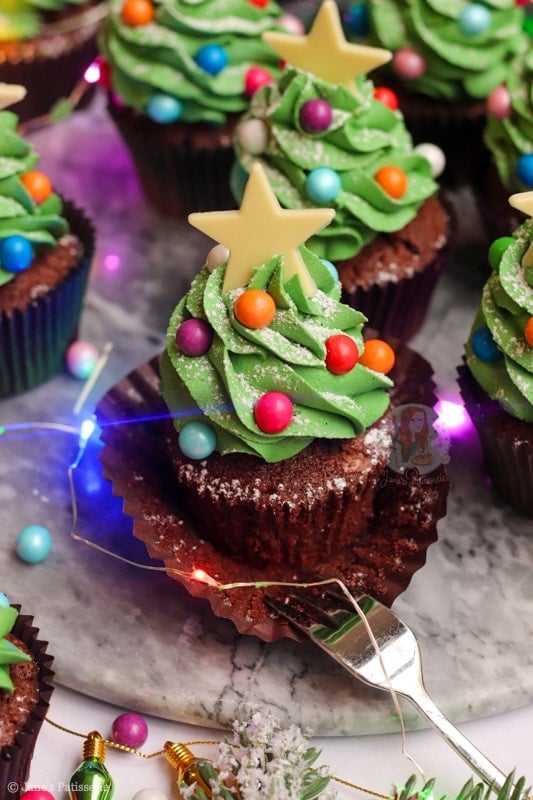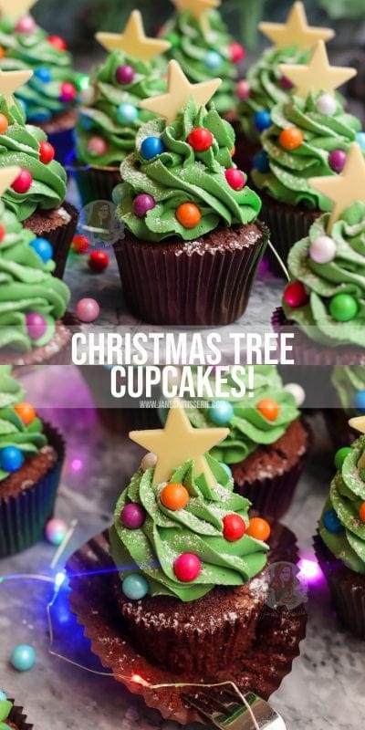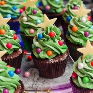 Delicious and easy Christmas tree cupcakes with a chocolate cupcake base, vanilla buttercream frosting, and cute Christmas tree style decoration!