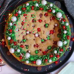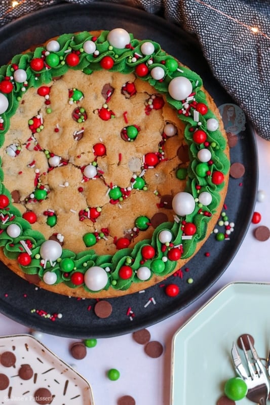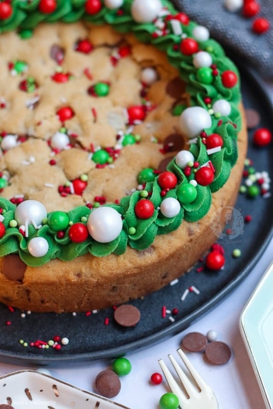 I used an 8″/20cm tin for this giant Christmas cookie, to get it slightly smaller but deeper. If you wanted to make thinner and larger cookie, use a 9″ circle tin, but bake for 20 minutes instead! You don’t need to change any of the ingredients. Simple as that! Enjoy x