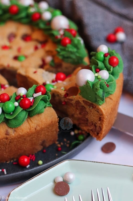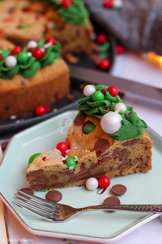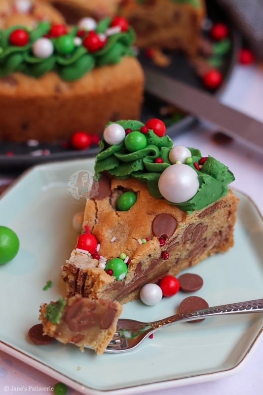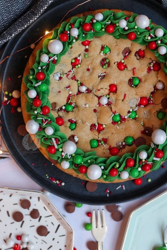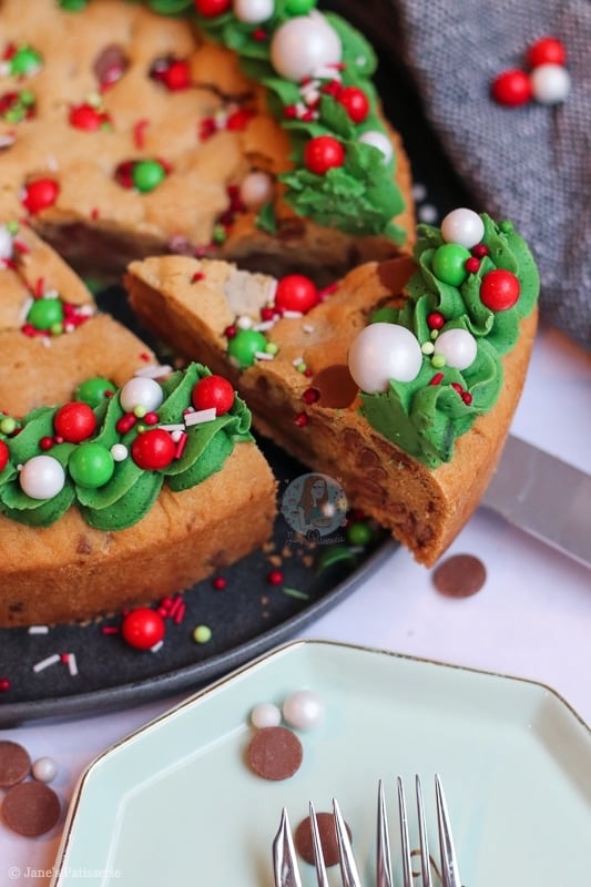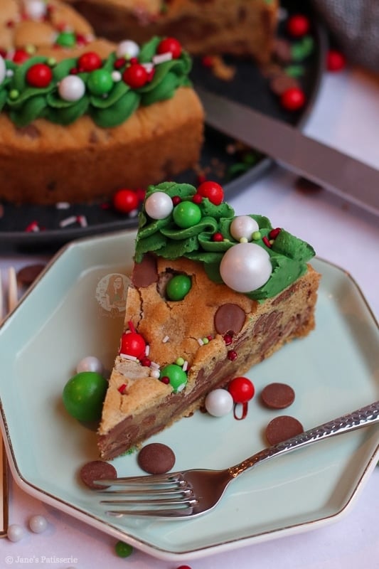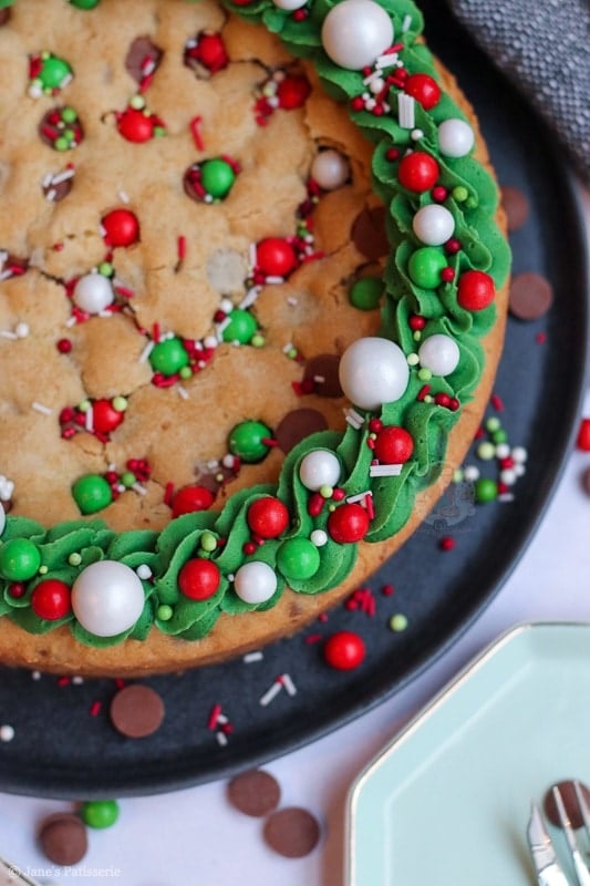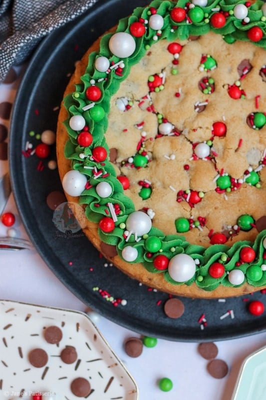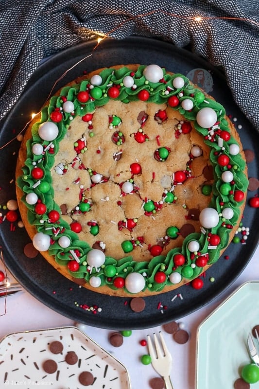 An easy and sweet giant Christmas cookie, stuffed with chocolate chips, chocolate chunks, and decorated for the festive period!