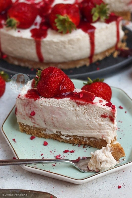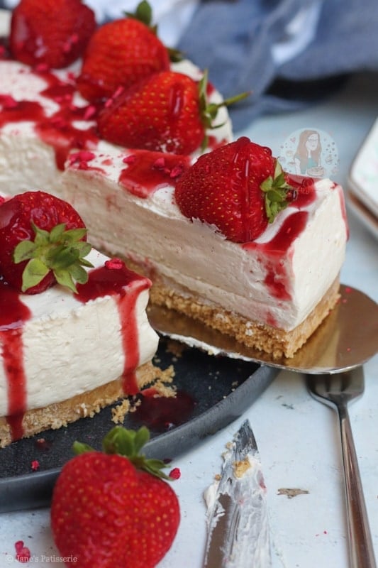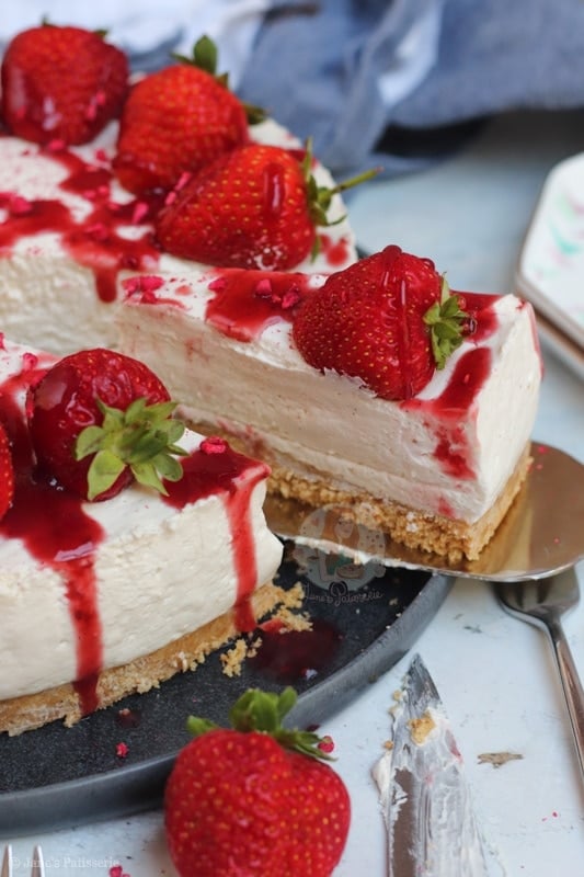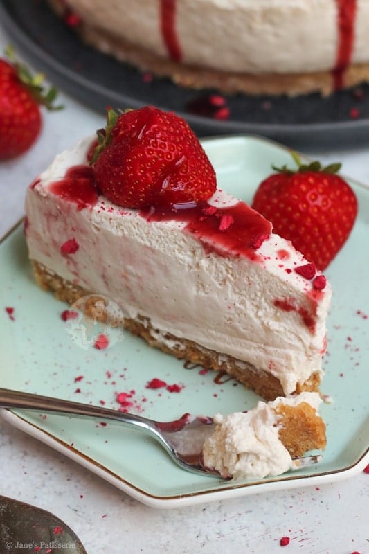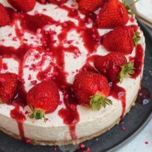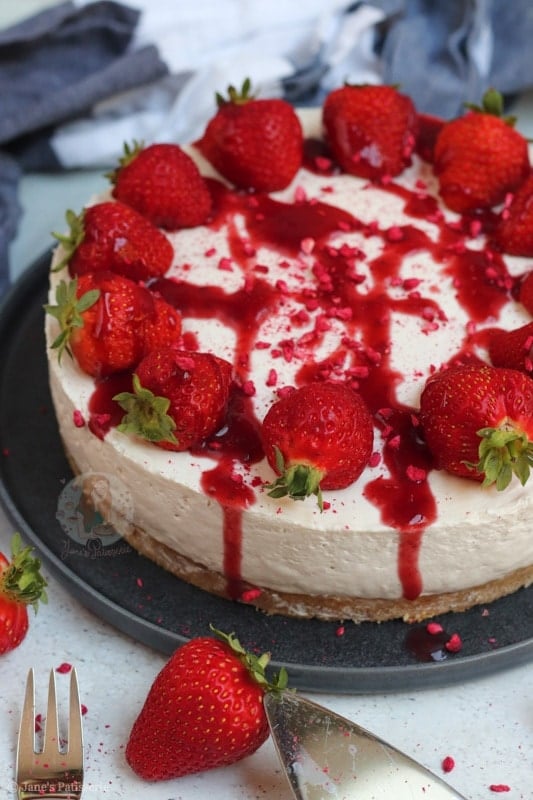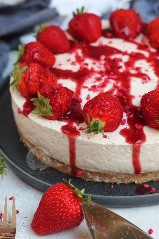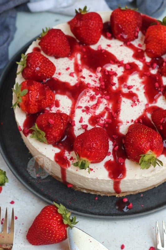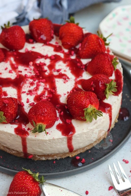 Once the cheesecake has set overnight, I drizzled it with some strawberry coulis, added some fresh strawberries on top, and sprinkled with freeze dried strawberries too. All decoration is optional, but I just fancied a fruity theme!