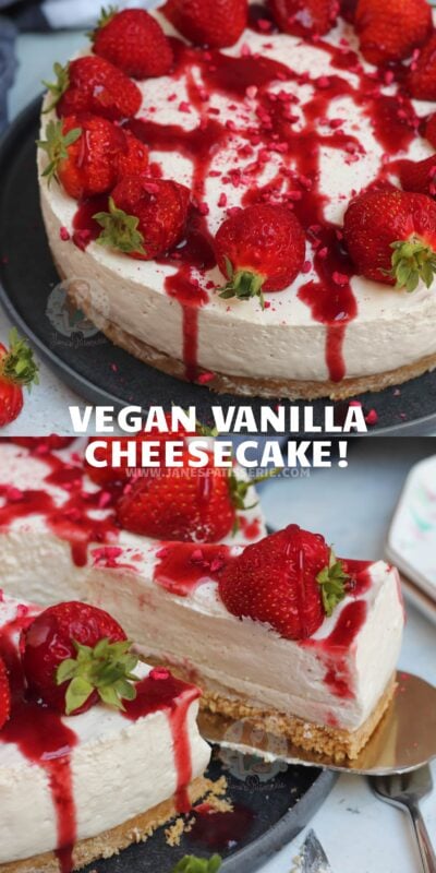 A deliciously creamy no-bake vegan vanilla cheesecake – with a biscuit base, vegan cheesecake topping, strawberry coulis, and fresh strawberries!