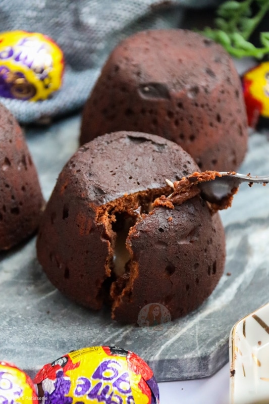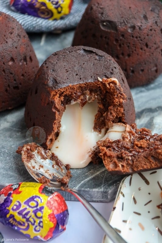 - Split the mixture evenly between the four pudding moulds, and carefully press in a frozen creme egg (on it's side). Press the creme egg in fully, and cover the top if you can still see it with mixture.