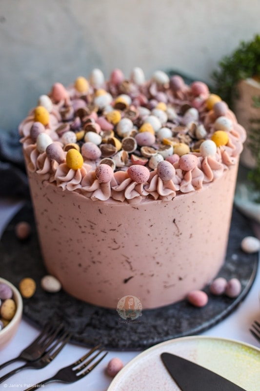 I used a pastry brush and flicked the brush ends to create a speckle, as well as flicking all of the brush for slightly bigger ‘speckle’ bits. It’s messy, but it is so much fun to do! I then used leftover buttercream around the top, and topped it with mini eggs because why not?!