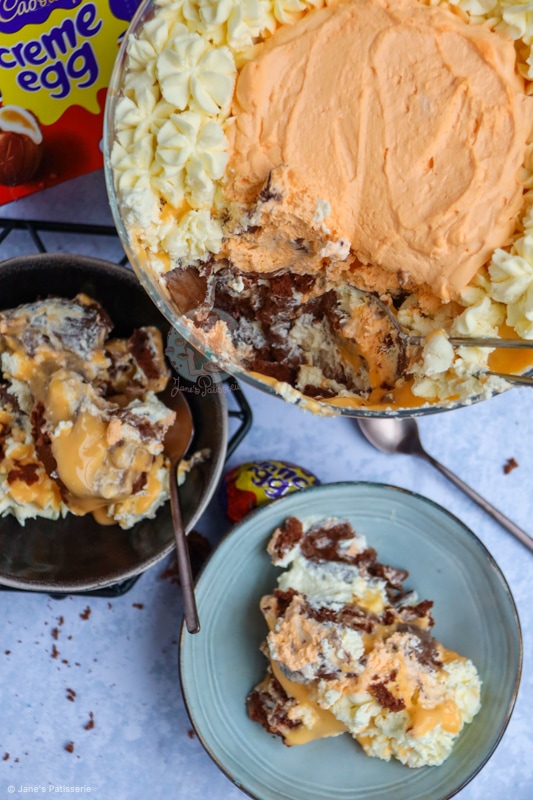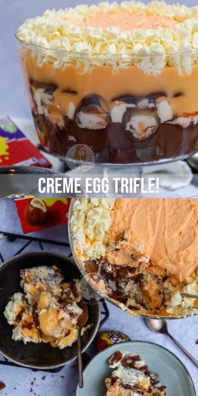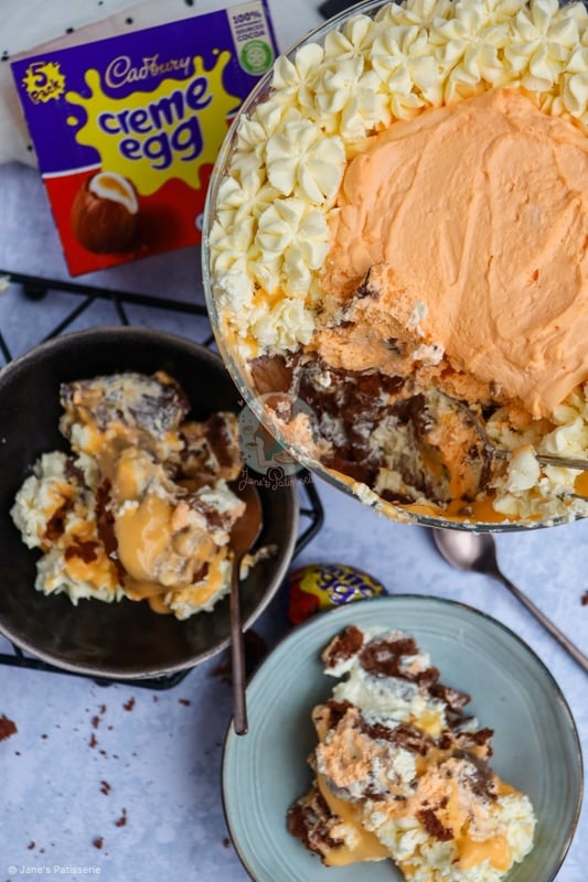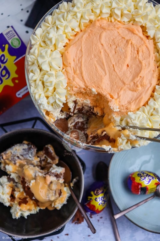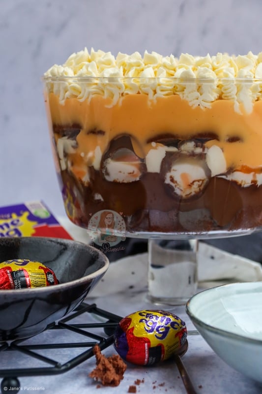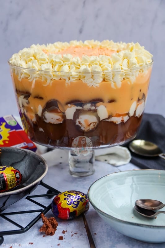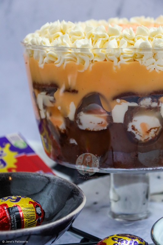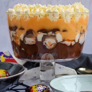 A delicious Creme Egg trifle with chocolate custard, orange custard, chocolate sponges, Creme Eggs, whipped cream and more…!