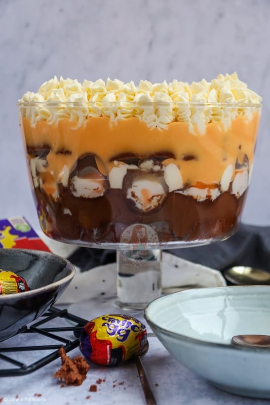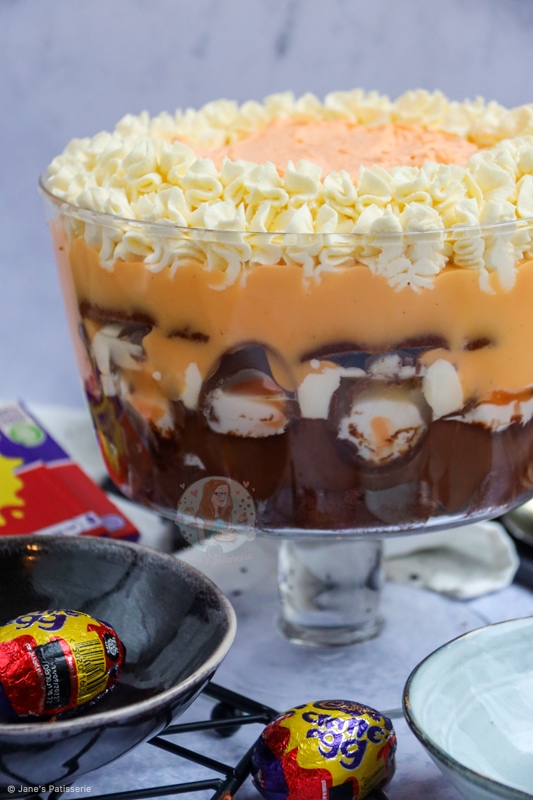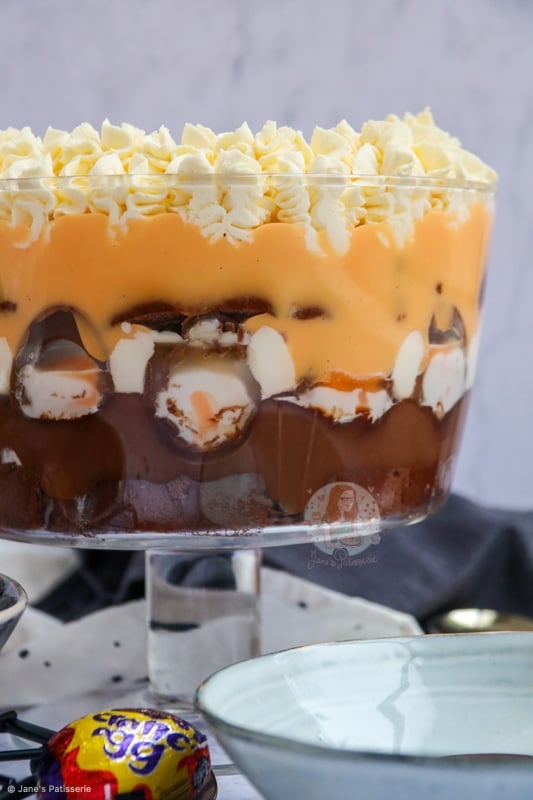 In my Creme Egg trifle, I used some dark chocolate to melt into one batch of custard so it had a different flavour, and used some orange food colouring in the second. You can of course flavour this custard too, but I didn’t bother as I liked it as vanilla. A trifle is all about you doing what you want!