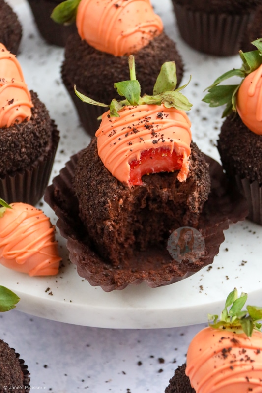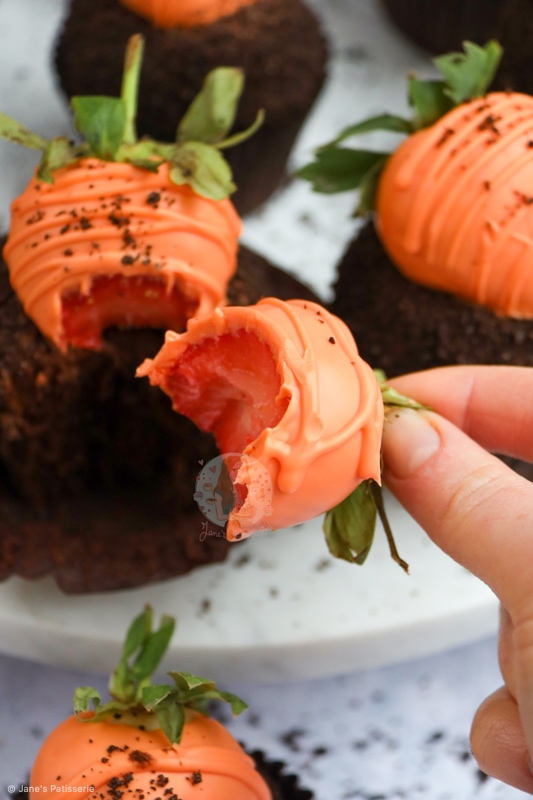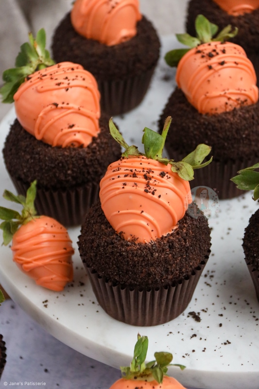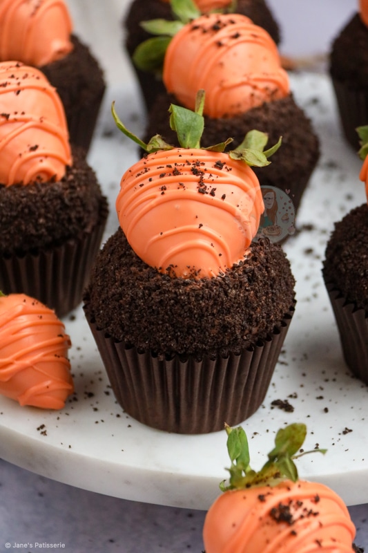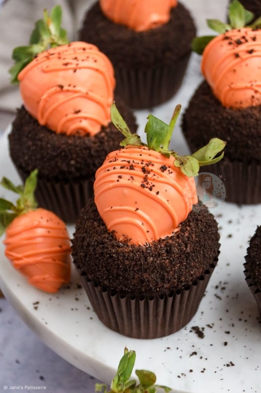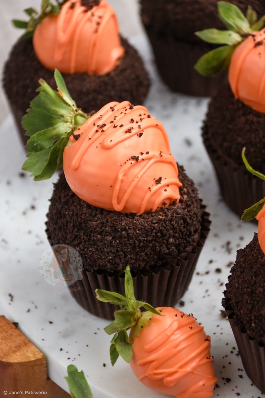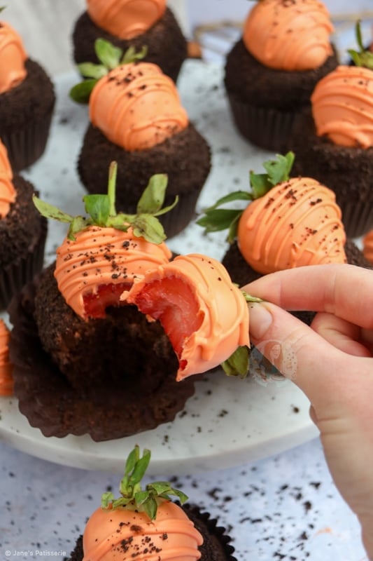 And finally for the carrots to create these carrot patch cupcakes… if it wasn’t obvious enough already, they are strawberries. It’s a classic alternative to create something sweet compared to using an actual carrot – chocolate coated strawberries! They’re fun, they are cute, and they work PERFECTLY for these cupcakes.