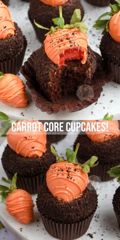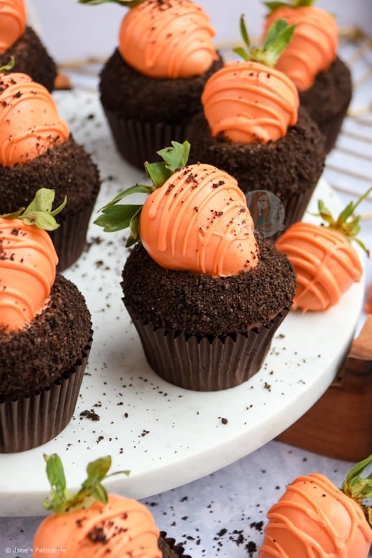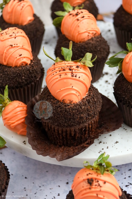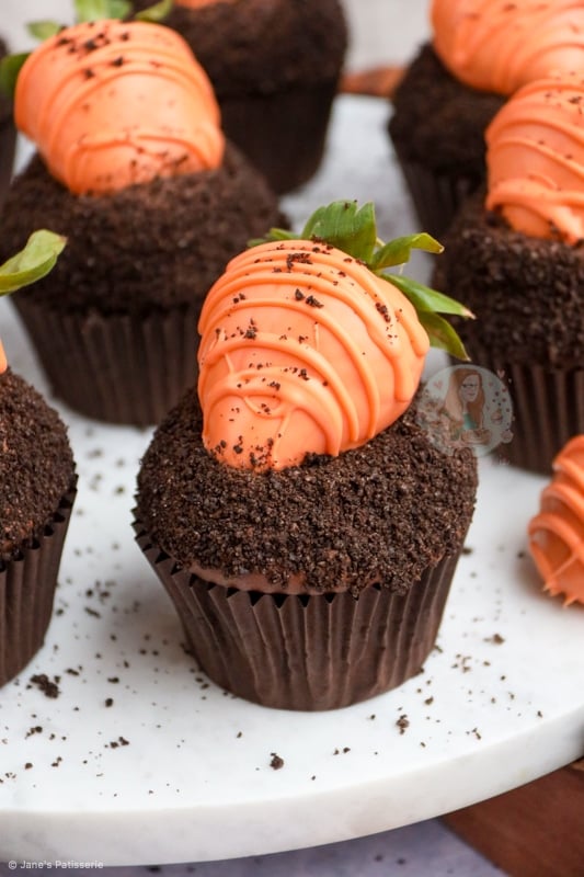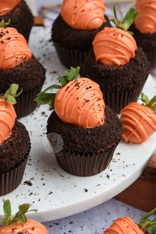 - Add a chocolate coated strawberry carrot to each cupcake.