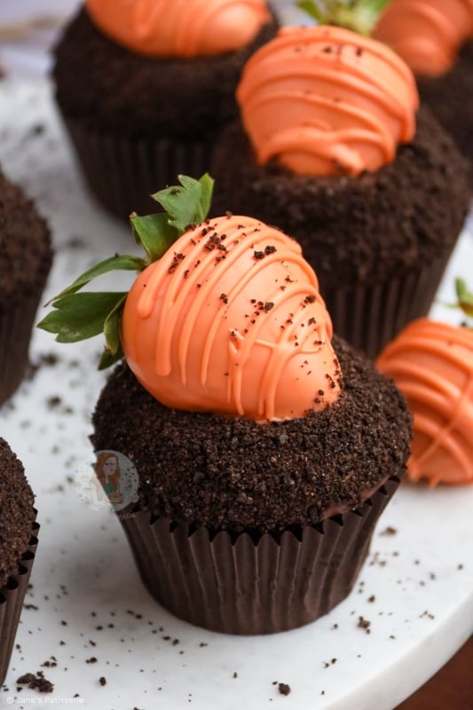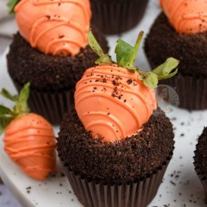 Cute and delicious chocolate cupcakes topped with a chocolate buttercream, oreo dirt, and chocolate coated strawberries for carrot patch cupcakes! Perfect for Easter.