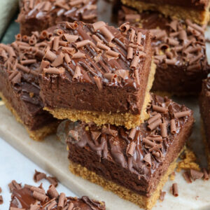 Delicious baked chocolate cheesecake bars with a biscuit base, creamy and delicious chocolate cheesecake filling, and a chocolate drizzle topping!