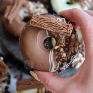 For this recipe, I used this dark chocolate which I use in all of my baking, this milk chocolate for the chocolate chips inside the bronuts and the decoration, this silicone doughnut mould and this white chocolate.