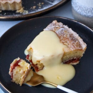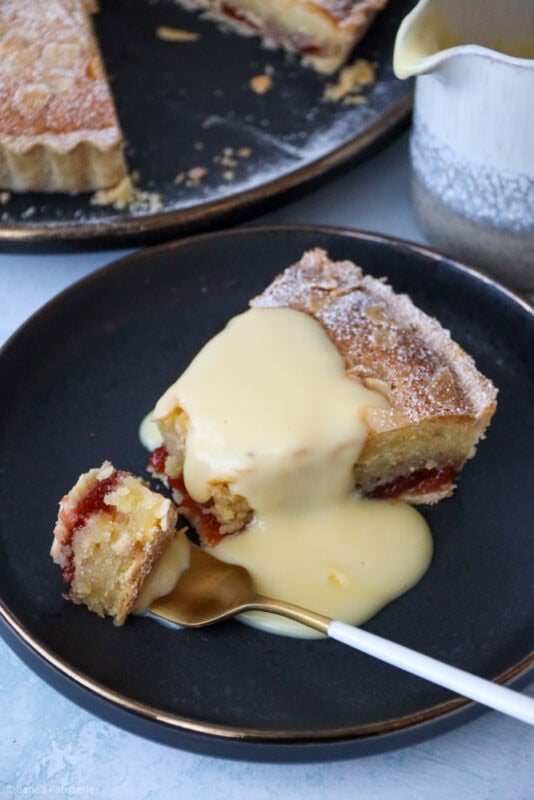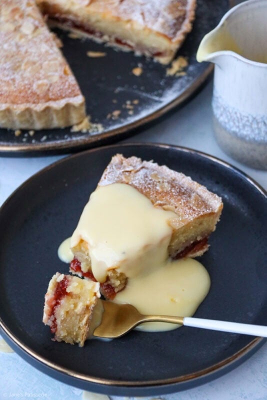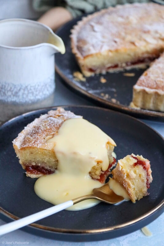 I absolutely devour this Bakewell tart because it’s just so good. You can serve it with custard, ice cream, cream or even just on its own – the flavour carries so well that you can do whatever you want! Honestly, it’s the best.