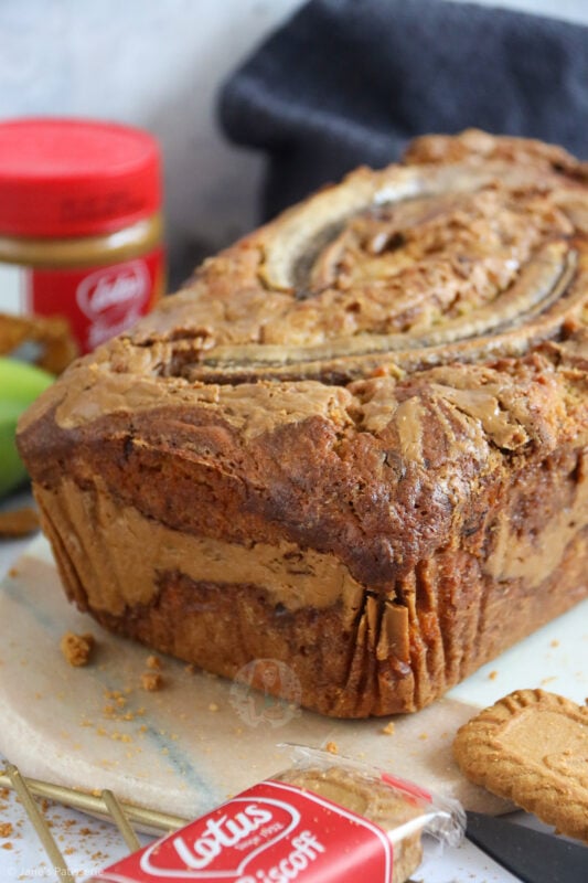 Deliciously easy Biscoff banana bread with a simple chocolate chip banana bread base, with Biscoff swirled throughout!