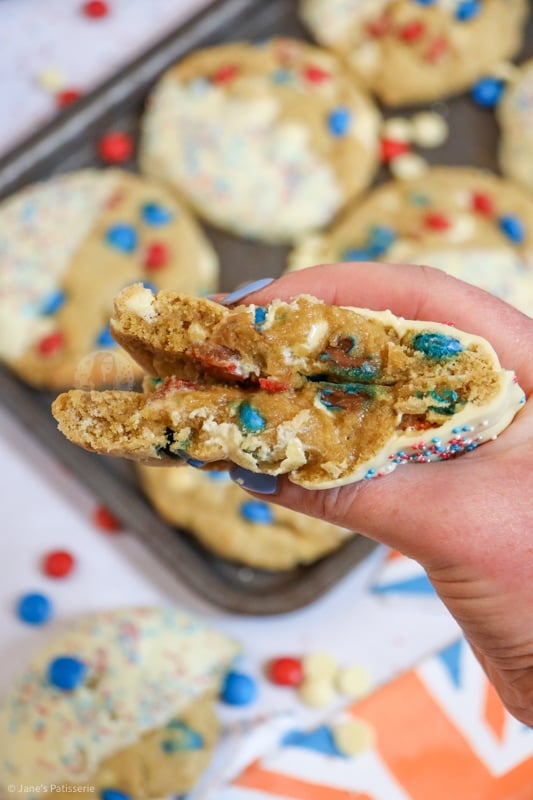 I used white chocolate chips in the main base of the cookie recipe to have an element of ‘white’ in there, and also to bring some level of gooeyness to the cookie. NYC Cookies need to be gooey right?! I then did pick red and blue M&Ms out of packets until I had enough – if that isn’t dedication, I don’t know what is. Don’t worry, I’ll just eat the other colours.