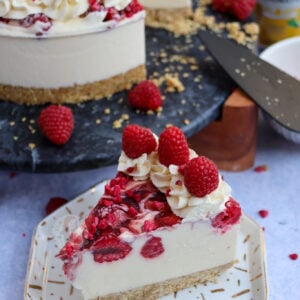I decided to just decorate my cheesecake with some whipped cream, freeze dried raspberries and fresh raspberries. It’s quite simple, but I always find decoration like this just looks absolutely beautiful on the dessert.