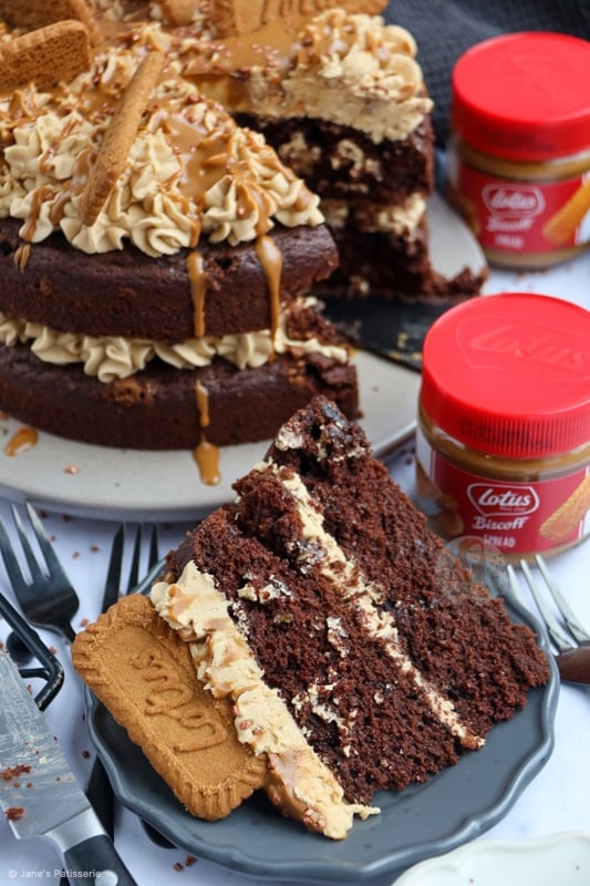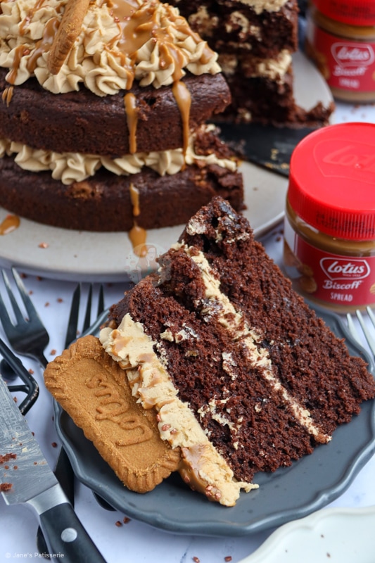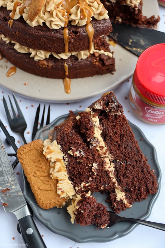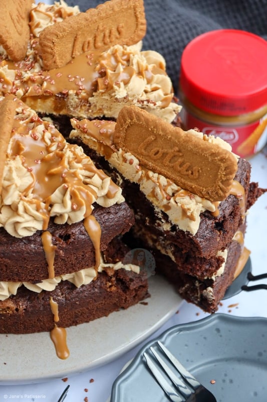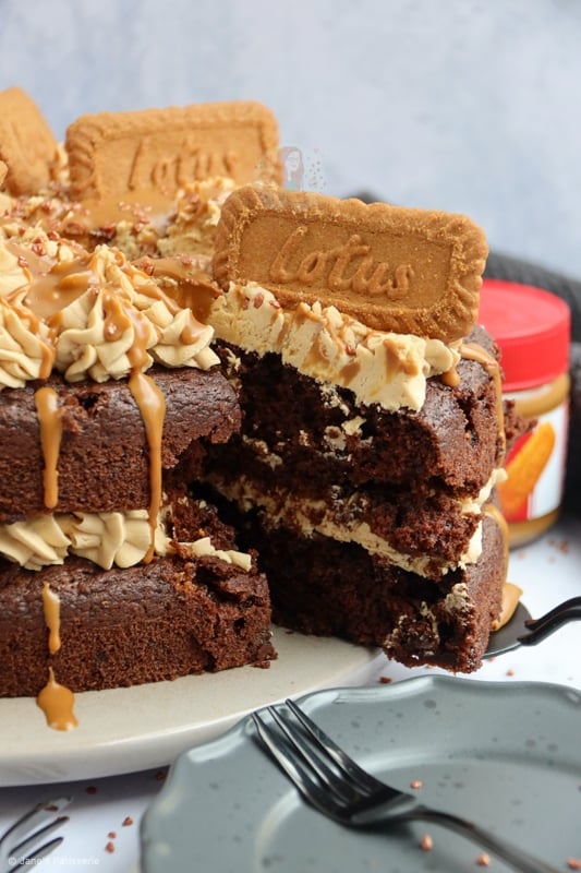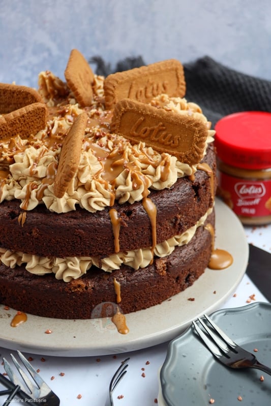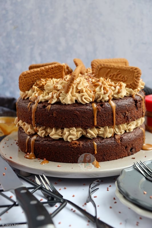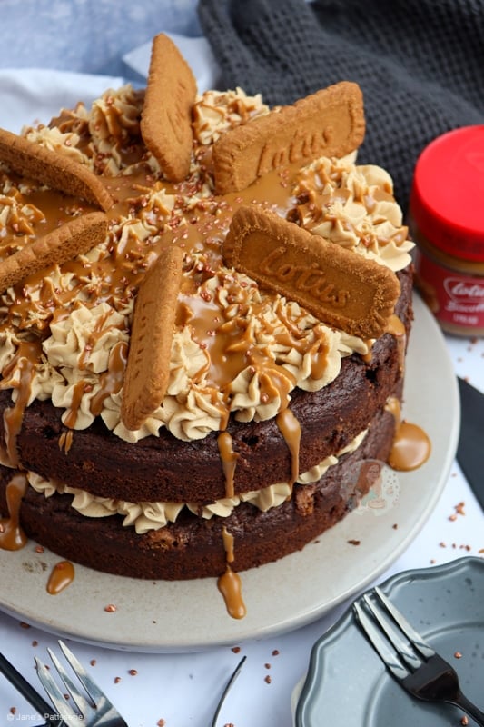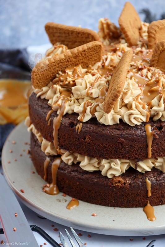 A two-layer delicious chocolate cake, with biscoff buttercream, biscoff decoration and more… the perfect vegan biscoff cake!