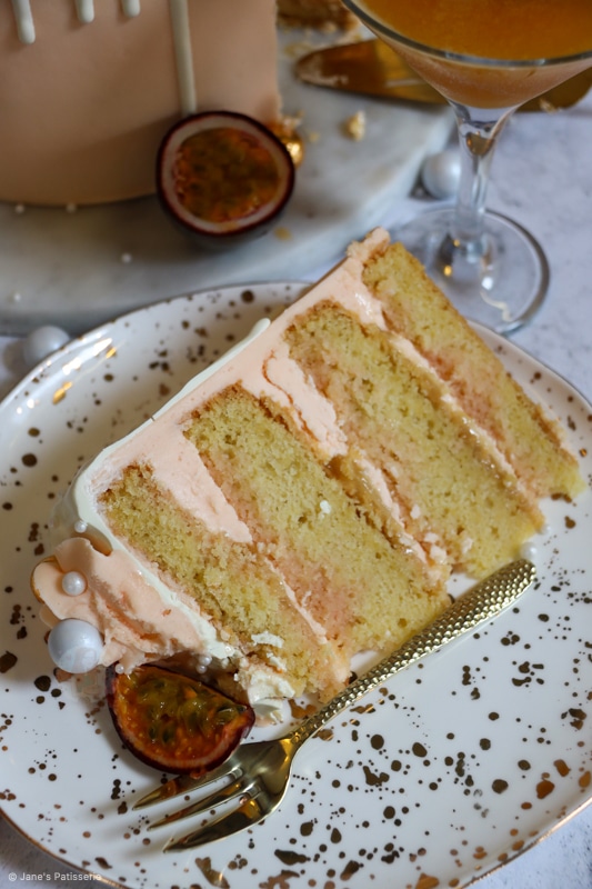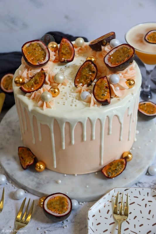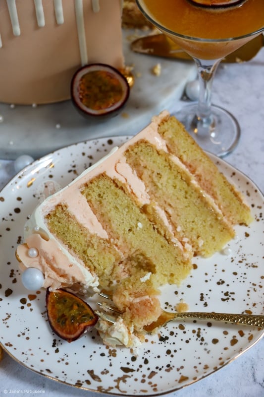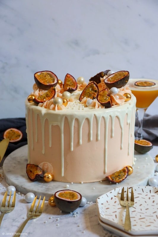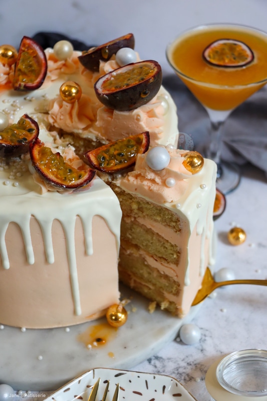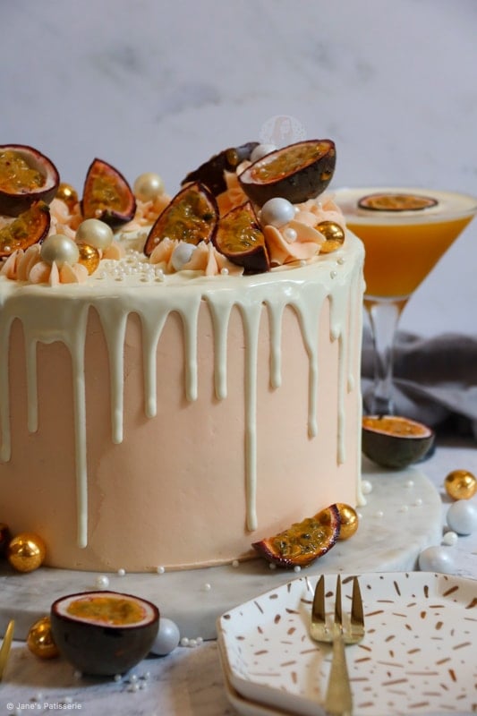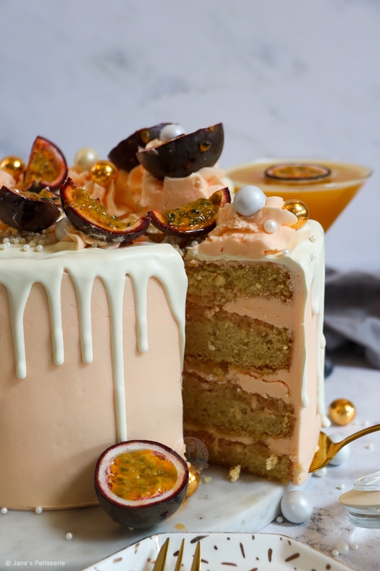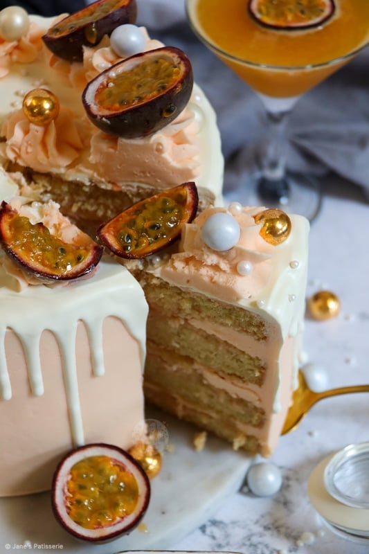 A four-layer passionfruit martini cake with passionfruit martini soaked vanilla sponges, passionfruit curd, and even more!