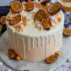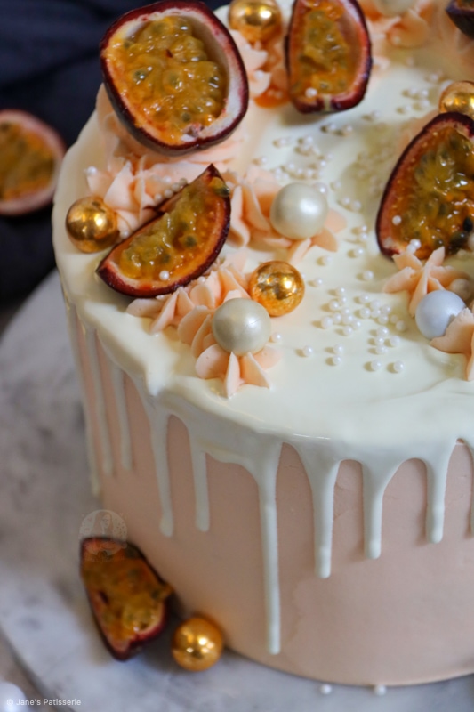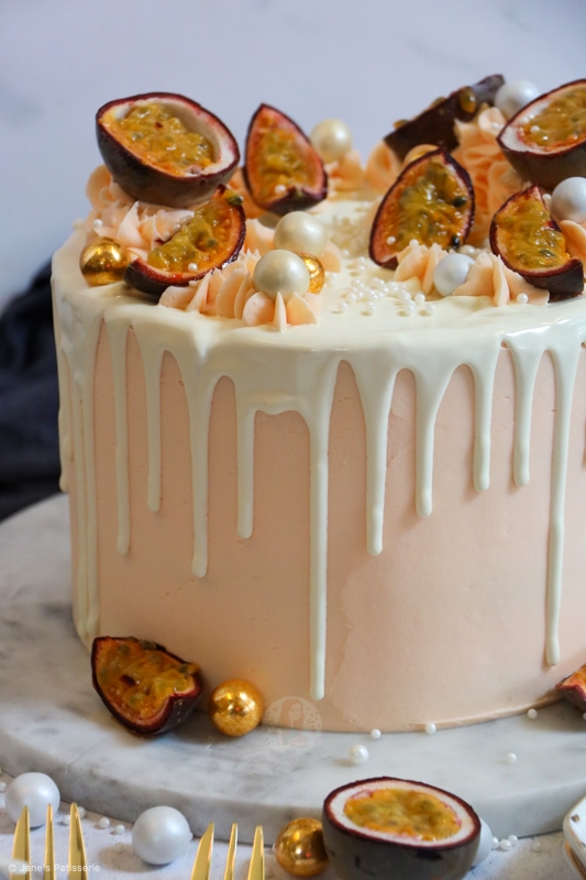 Because the frosting is a beautiful peach colour I wanted to contrast with a white chocolate drip, and I am so glad I did! The colour difference is what makes it look a little more Passionfruit Martini like, and also I so just love a drip cake as you all know. White chocolate drips are also super easy with 3:1 chocolate to cream.