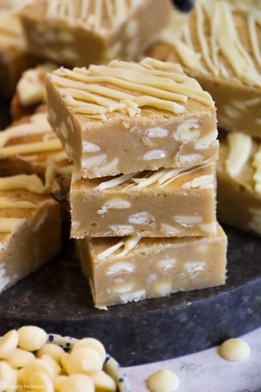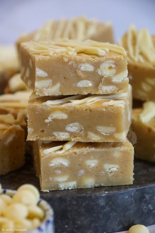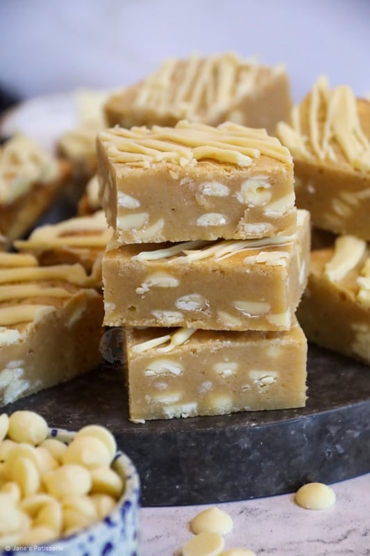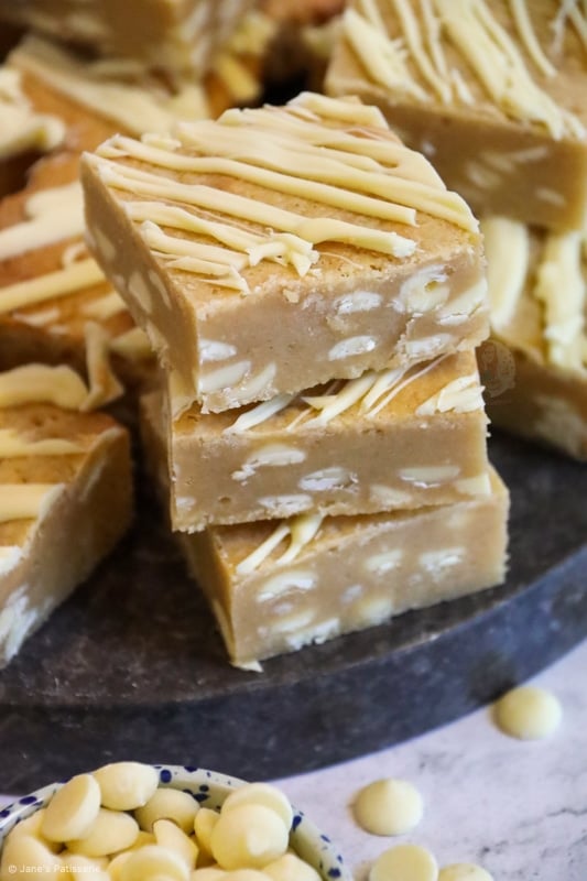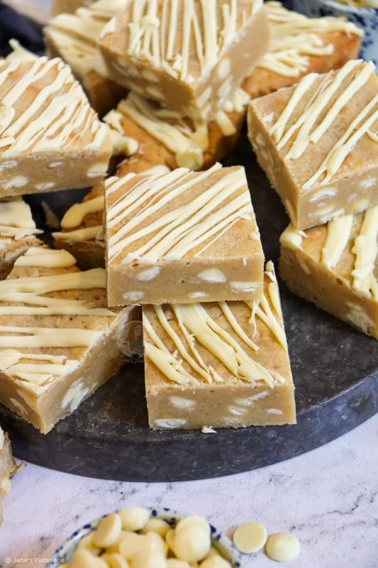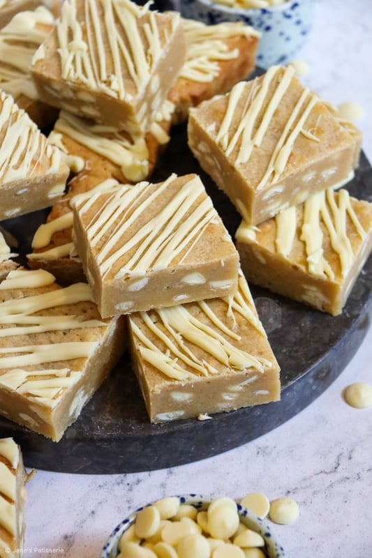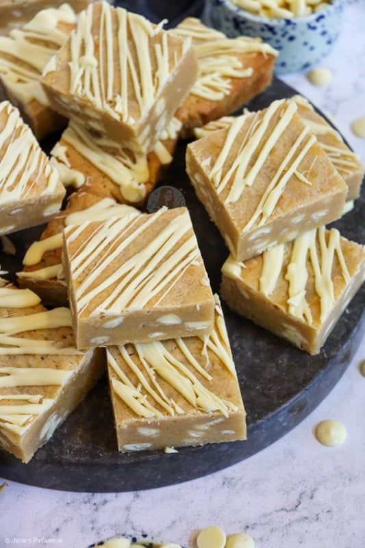 For me, a blondie is a ‘white’ version of a brownie. This is however my first recipe to include melted white chocolate in the base because it took so long to perfect the recipe to make sure it wasn’t greasy or horrible.